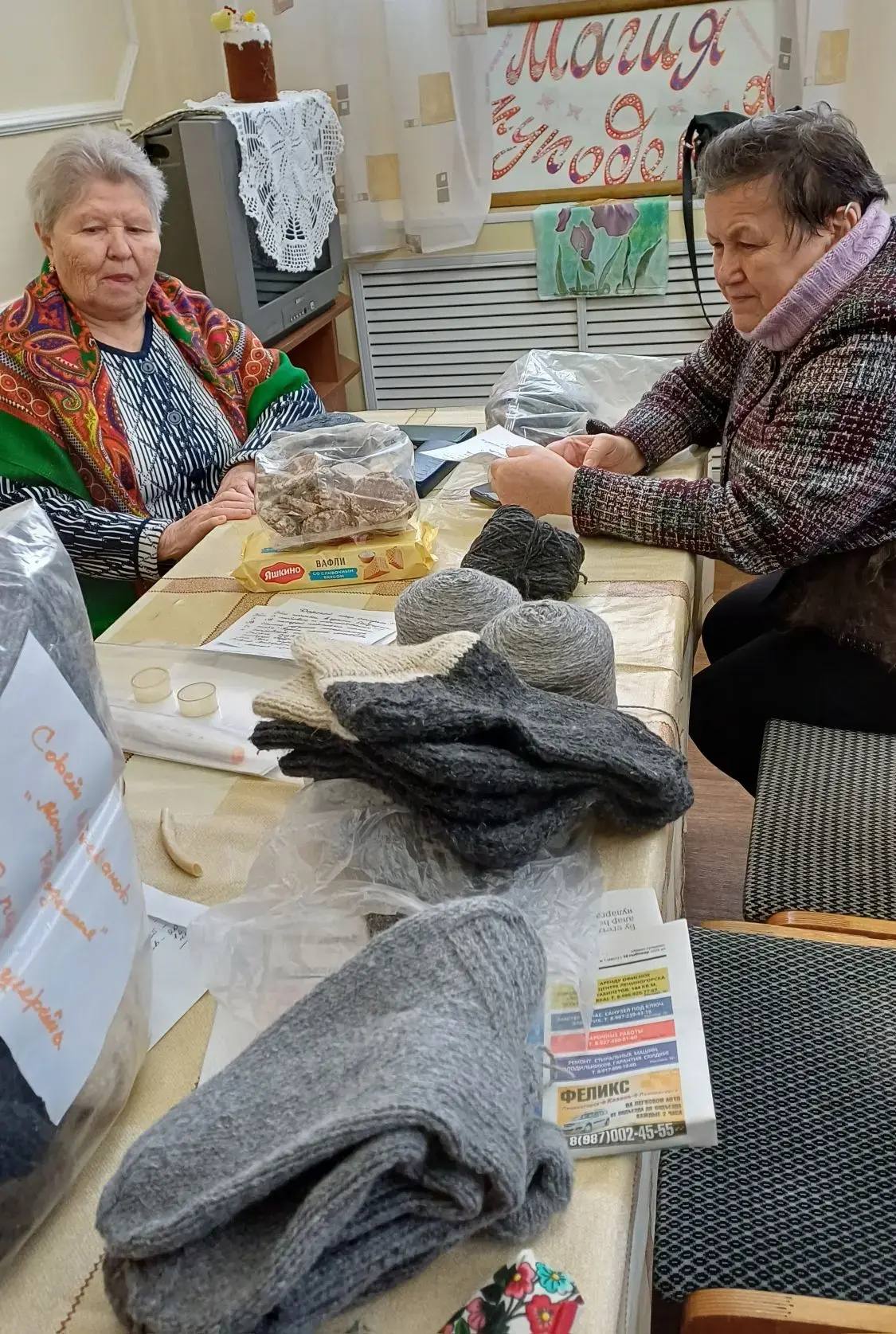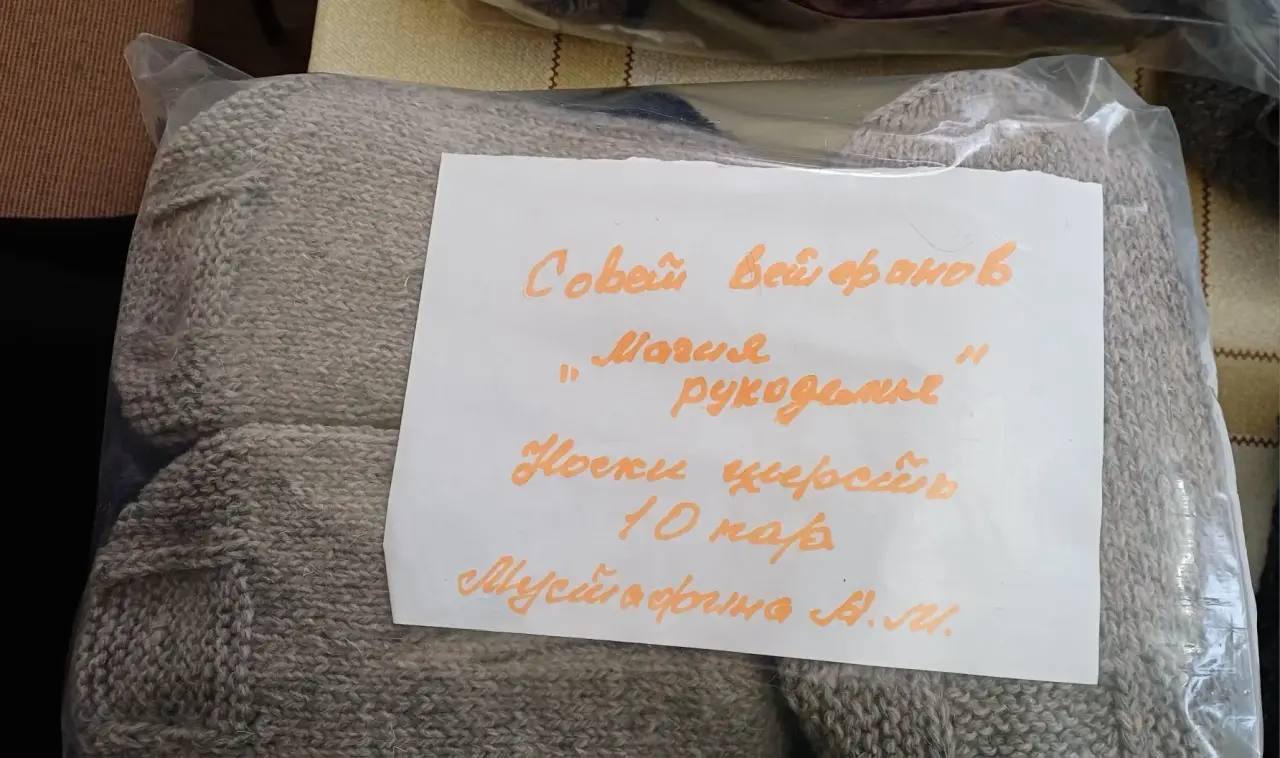 Ветераны из кружка "Магия рукоделия" связали и приготовили для отправки нашим танкистам 89 пар шерстянных носков, Тимяшевские волонтёры привезли целый мешок шерстянных носков, собственноручно заготовленные чаи с сахаром.