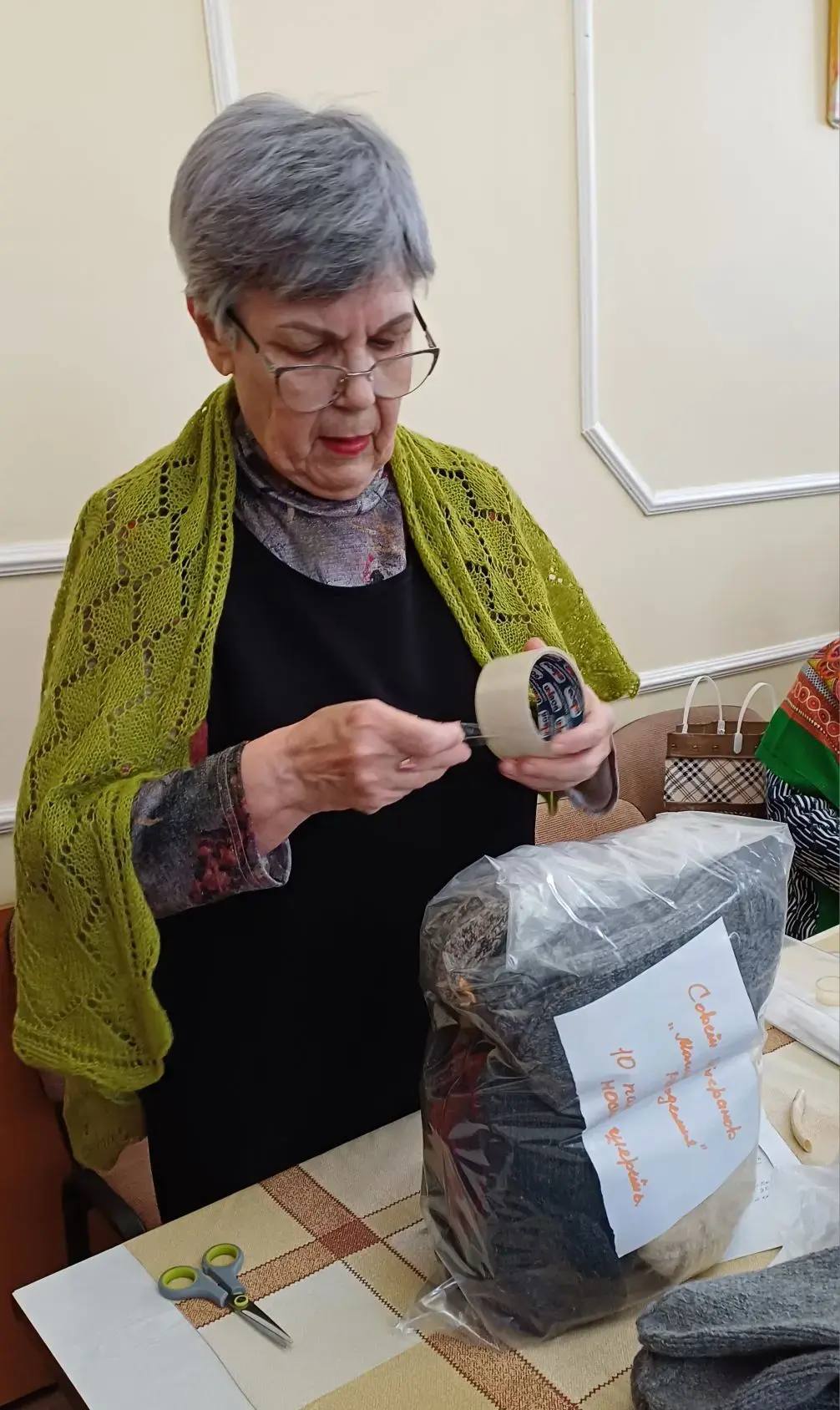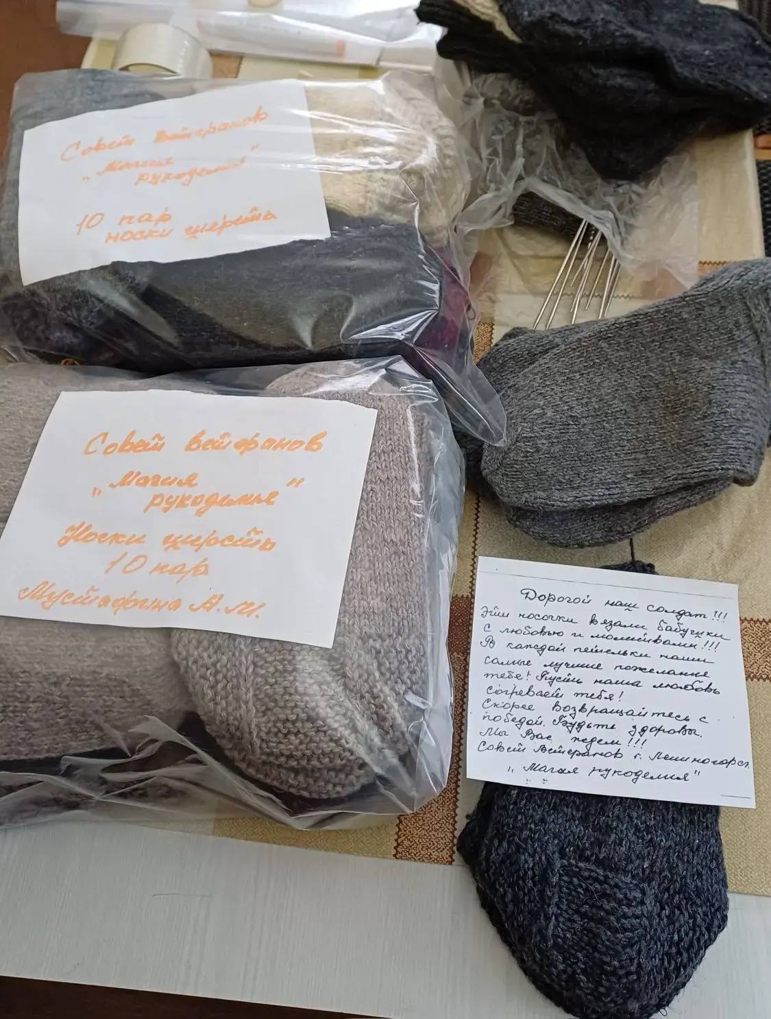 Наши рукодельницы собрали связанные шерстяные носки для наших бойцов, упаковали, написали им тёплые, душевные письма.