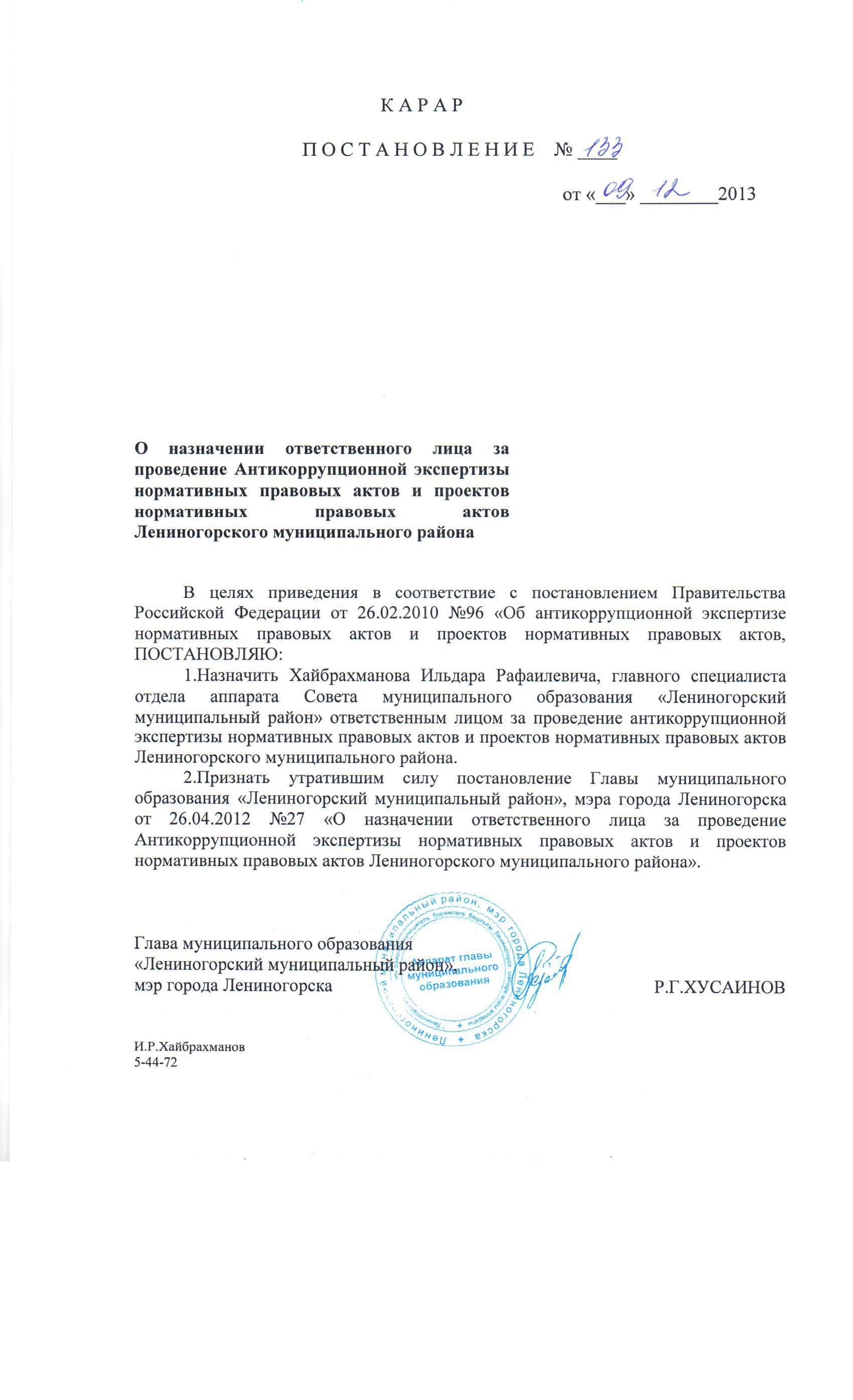 Постановление от 09.12.2013 №133 "О назначении ответственного лица за проведение Антикоррупционной экспертизы нормативно-правовых актов и проектов нормативно-правоввых актов Лениногорского муниципального района"