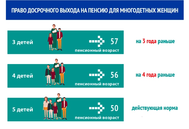 Помимо сохранения прежних льгот по досрочному выходу на пенсию, вводятся новые основания назначения пенсии раньше достижения пенсионного возраста. Право уйти на пенсию на два года раньше будет предоставлено женщинам, имеющим стаж 37 лет, и мужчинам, имеющим стаж 42 года. Воспитавшие трех или четырех детей женщины смогут выйти на пенсию досрочно на три и четыре года соответственно.