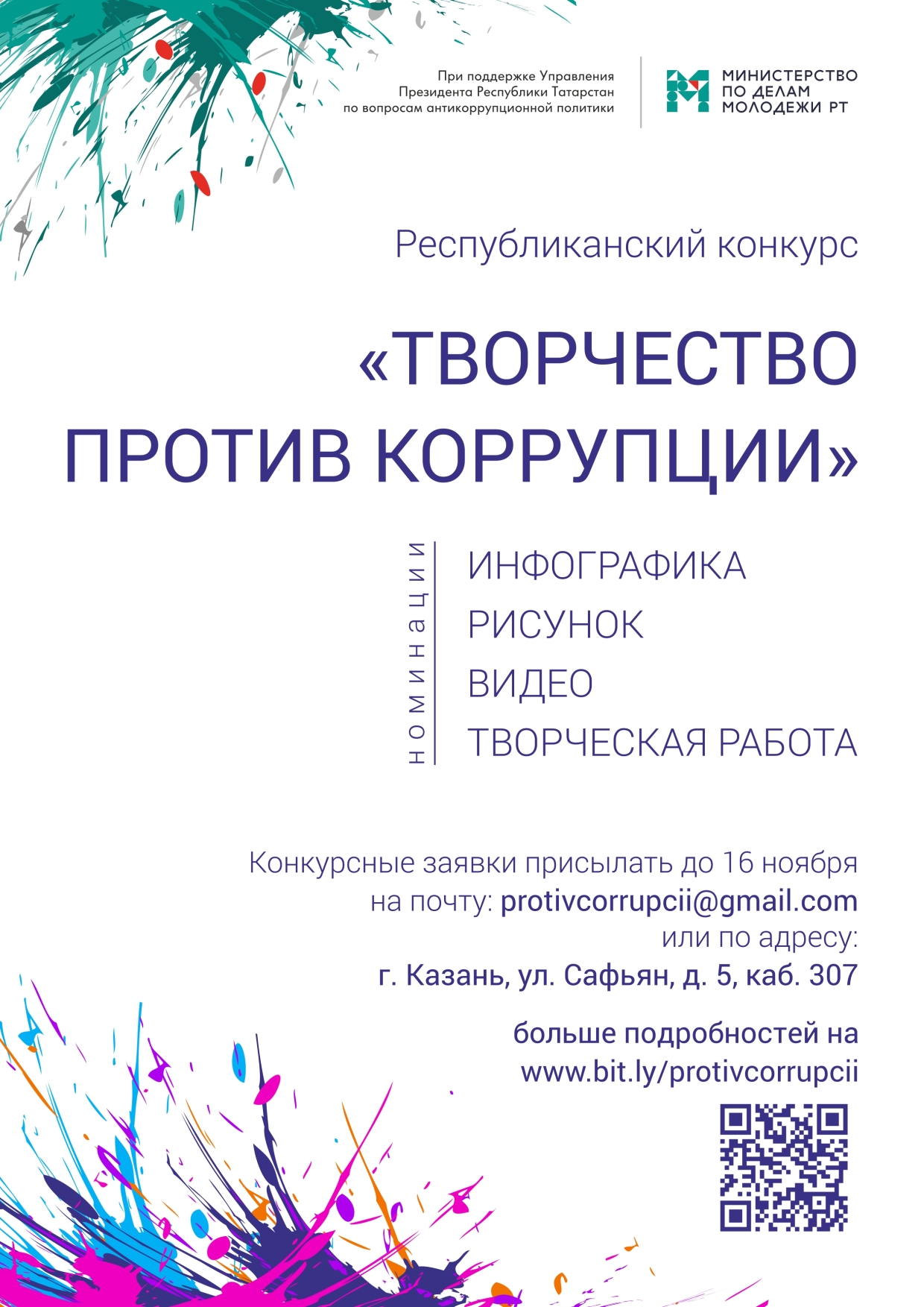 Куда подавать заявку. Конкурсные материалы принимаются до 16 ноября 2018 года в новом здании Министерства по адресу: г.Казань, ул. Сафьян, д.5, каб.307 или по электронной почте protivcorrupcii@gmail.com. Количество заявок от одного участника не ограничено.