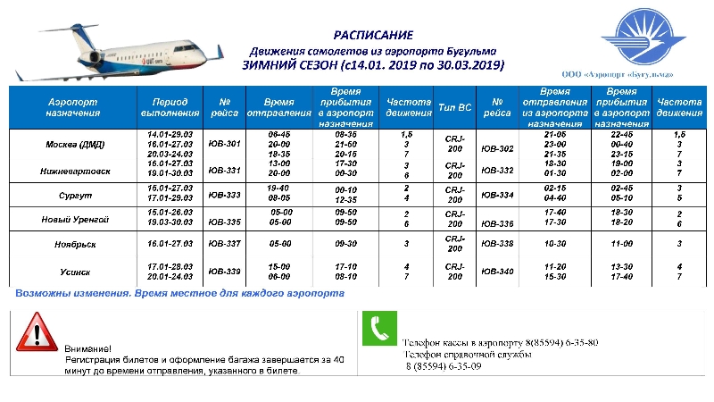 Расписание движения самолетов из аэропорта Бугульма ЗИМНИЙ СЕЗОН (с14.01. 2019 по 30.03.2019)