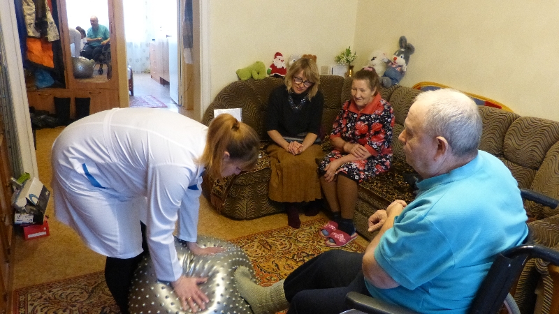 Очередное занятие прошло с выездом к людям, которые по состоянию здоровья не могут покидать дом. Медицинская сестра отделения надомного социального обслуживания Аглиуллина Надежда на практике показала основные правила перемещения больного с кровати на коляску и обратно, упражнения для реабилитации, обучила родственников основам ухода за больным в постинсультный период.