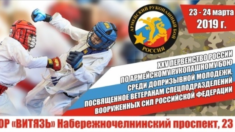 23 и 24 марта 2019 г. в городе Набережные Челны на базе СШОР «ВИТЯЗЬ» состоится XXV Первенство России по армейскому рукопашному бою среди допризывной молодежи, посвященное ветеранам спецподразделений Вооруженных Сил Российской Федерации. Торжественное открытие финальной части соревнований состоится 24 марта 2019 года, в 12.00 на базе СШОР «ВИТЯЗЬ» в городе Набережные Челны.