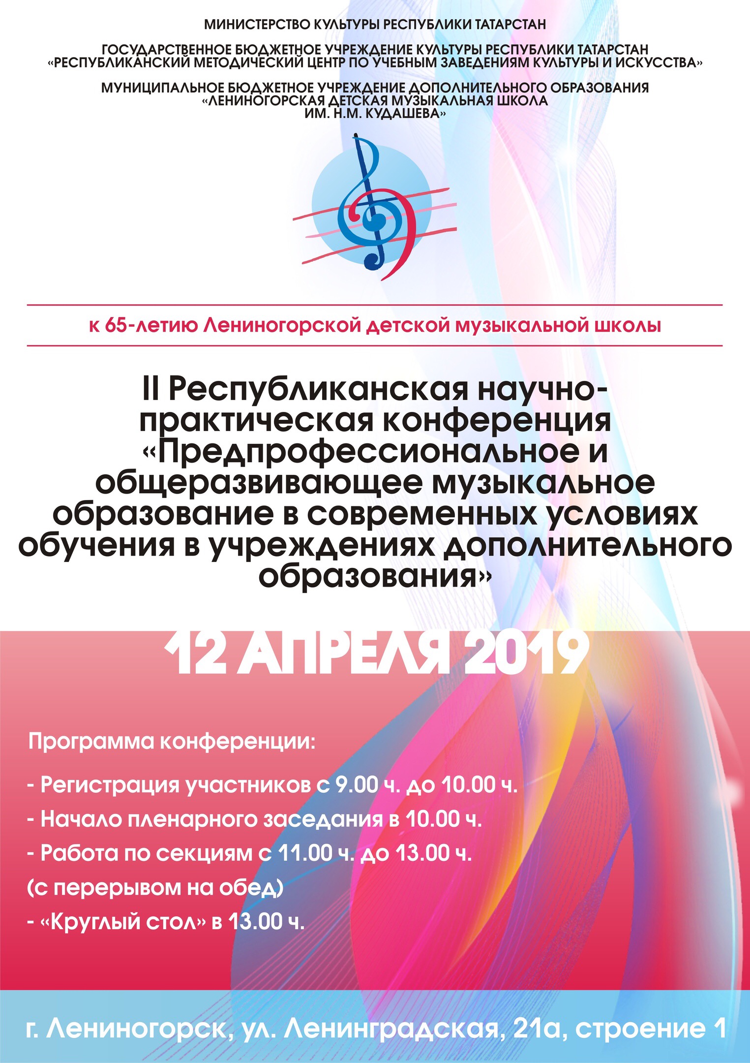 12 апреля 2019 года в ЛДМШ им. Н. М. Кудашева состоится II Республиканская научно - практическая конференция к 65 - летнему юбилею школы на тему "Предпрофессиональное и общеразвивающее музыкальное образование в современных условиях в учреждениях дополнительного образования"