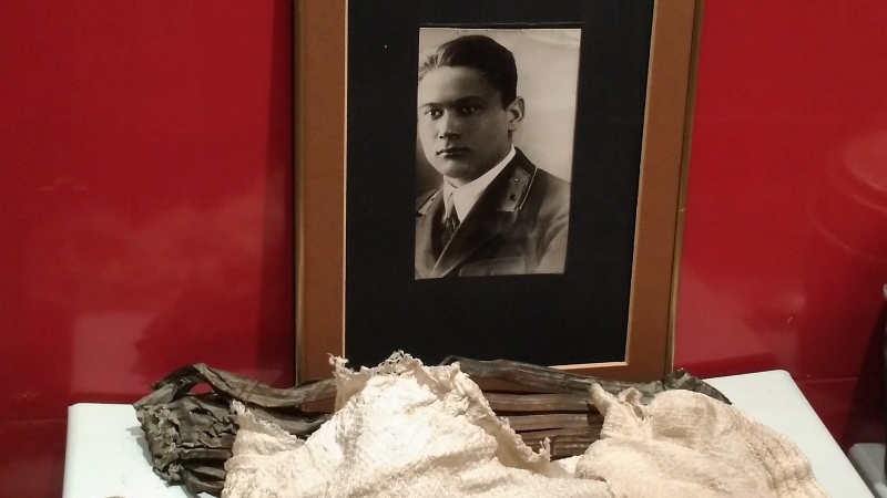 В музейной витрине, на подиуме представлены экспонаты: портрет молодого лётчика (на этом снимке Ханипов Хасан еще в звании младшего лейтенанта), кусок радиатора от его самолета и часть парашюта.