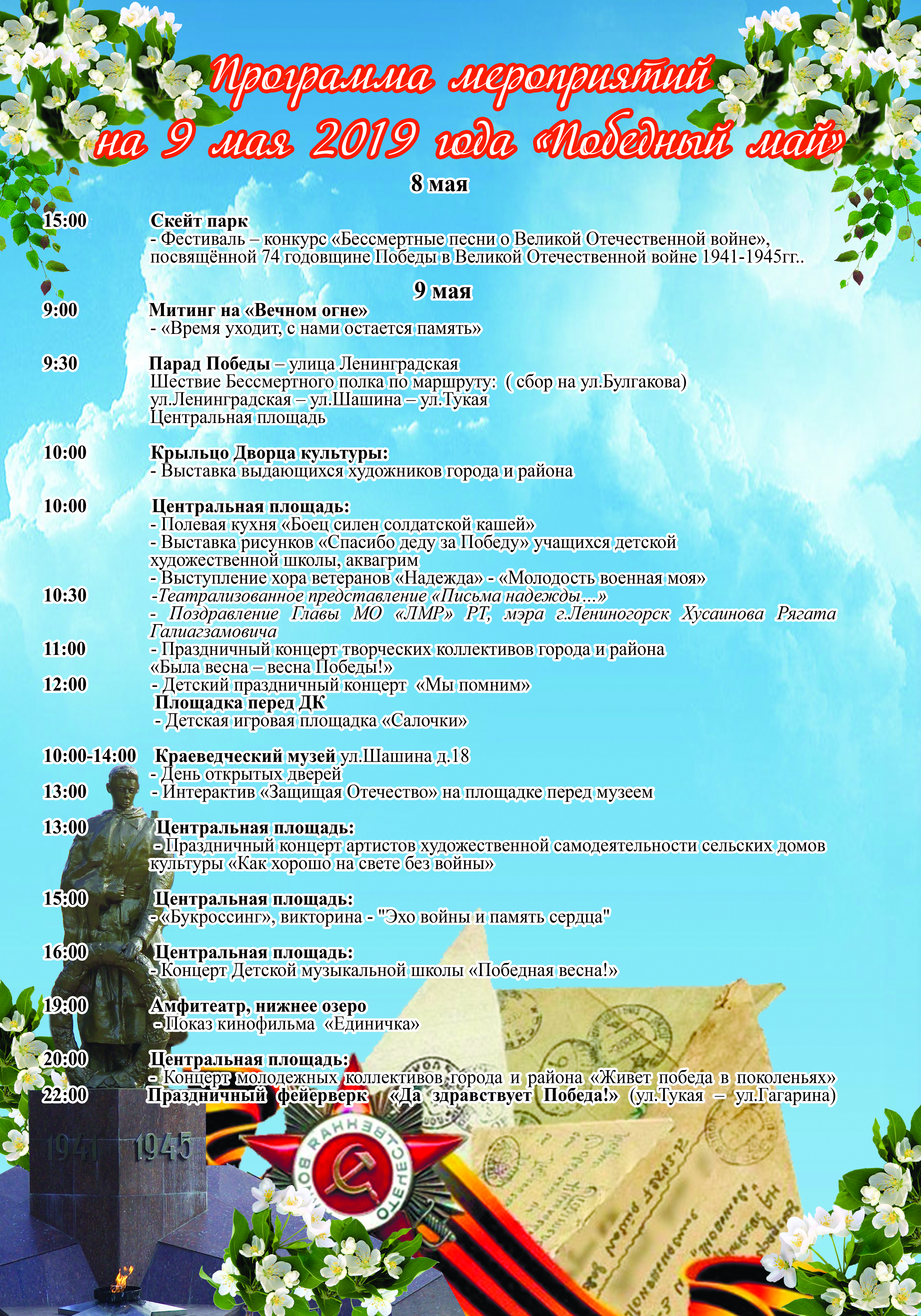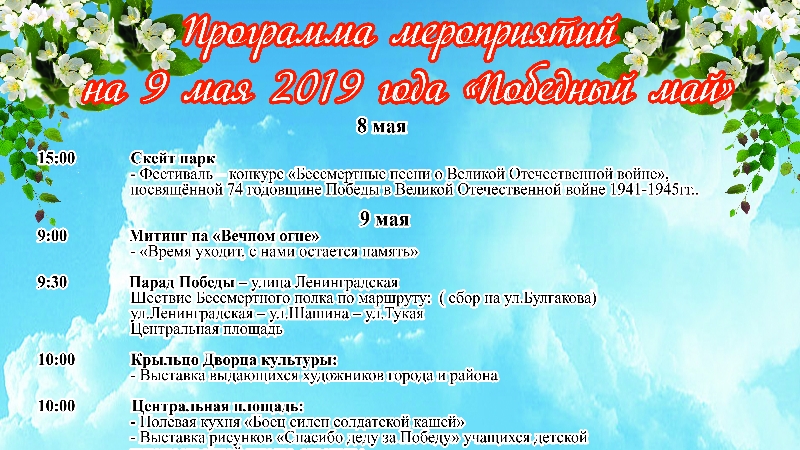 9 мая 2019 года в 9.00ч. состоится митинг «Время уходит, с нами остается память» возле памятника «Вечный огонь». Затем пройдет парад с элементами театрализованного представления, шествие участников акции "Бессмертный полк". Также состоятся праздничные концерты на площадках города.