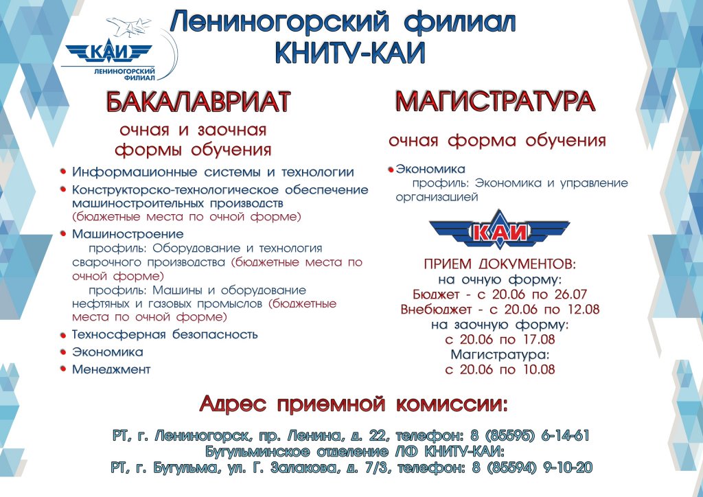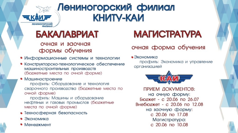 Лениногорский филиал «Казанского национального исследовательского технического университета им. А.Н. Туполева-КАИ» объявляет о начале приёмной кампании на 2019/2020 учебный год.