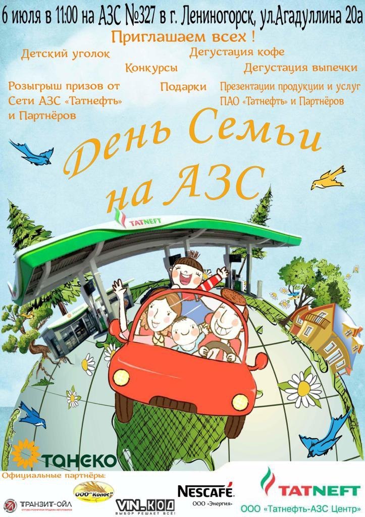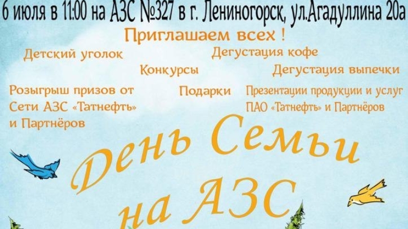 ООО «Татнефть-АЗС Центр» приглашает Всех на уникальное мероприятие совместное празднование семейного праздника «ДНЯ СЕМЬИ» НА АЗС!», приуроченное к празднованию всероссийского праздника Дня Семьи. Данное мероприятие имеет новый формат «Дня открытых дверей», которое состоится в выходной день 06.07.2019 г. в 11.00ч в г. ЛЕНИНОГОРСК на обновленной АЗС №327 «Татнефть» (ул.Агадуллинна д.20А, около МВД).