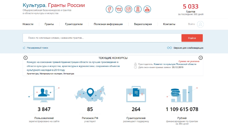 Информируем Вас о том, что на данном портале общероссийской базы конкурсов и грантов в области культуры и искусства есть возможность заявить об актуальных конкурсах, а также ознакомиться с существующими видами федеральных, региональных, муниципальных и частных грантов.