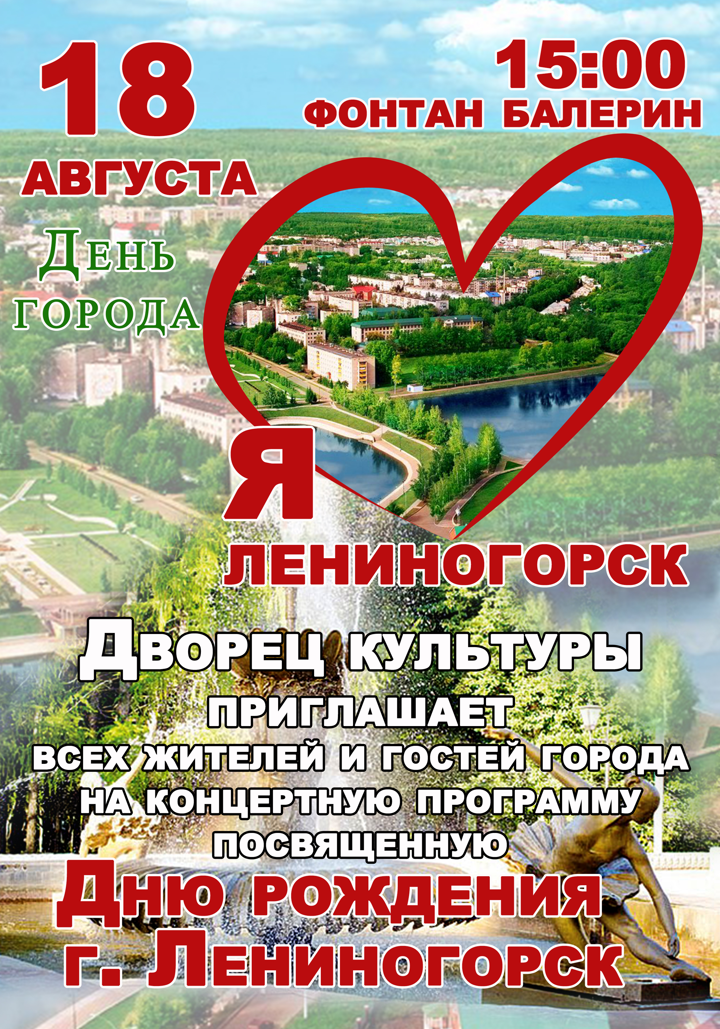 18 августа в 15:00 у фонтана Балерин состоится праздничный концерт "Я люблю Лениногорск", посвященный Дню рождения г.Лениногорска, с участием артистов художественной самодеятельности города и района.
