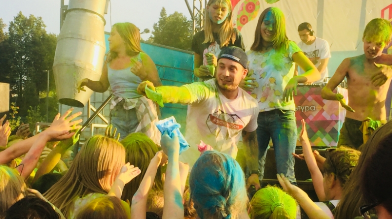 В 17:00 началось разноцветное шоу: гости совместно с ведущим запустили фонтан красок, который превратил парк в радугу. Затем лениногорцы с воодушевлением и яркими эмоциями окрашивали друг друга.