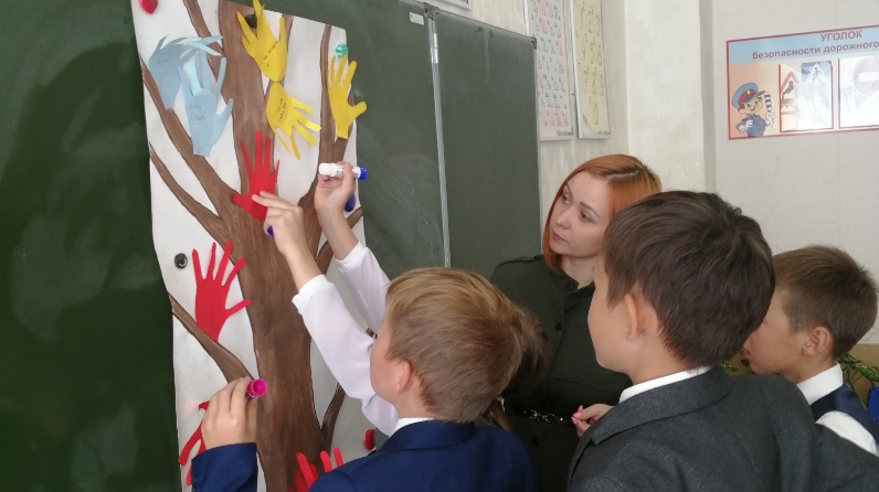На уроке была проведена акция «Дерево мира». Несовершеннолетние из разноцветной бумаги вырезали свои ладошки и на них написали пожелания всем людям.
