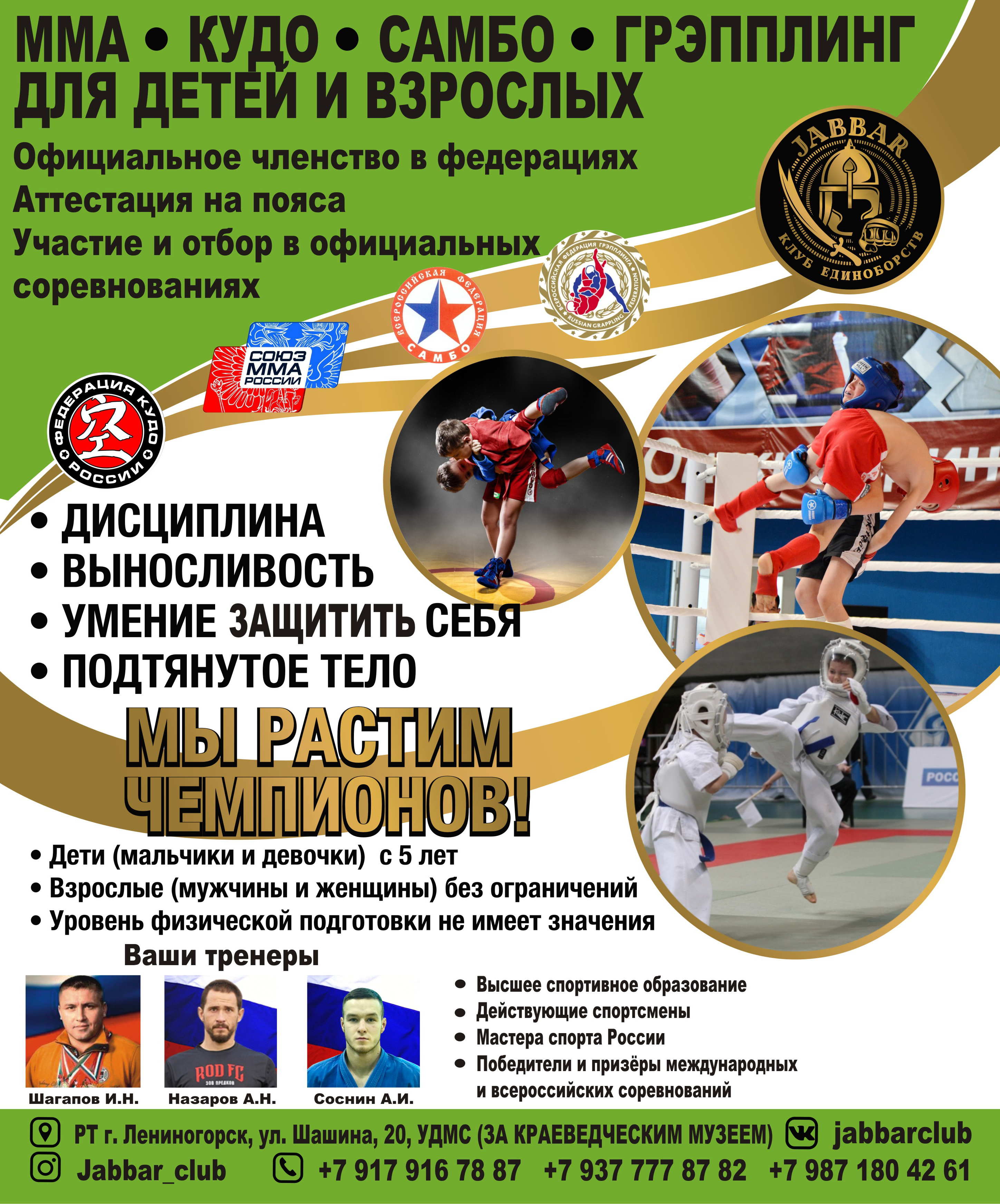 Клуб единоборств "JABBAR" приглашает на занятия детей от 5-ти лет и взрослых, в секции ММА (смешанное единоборство), КУДО (смешанное боевое единоборство), САМБО (самооборона без оружия), ГРЕППЛИНГ (борьба с болевыми и удушающими). Комфортные условия, новое оборудование, удобное расписание! Тренировки ведут профессиональные тренеры, действующие спортсмены, лицензированные федерациями, с высшим, спортивным, педагогическим образованием. Добро пожаловать в нашу огромную спортивную команду !
