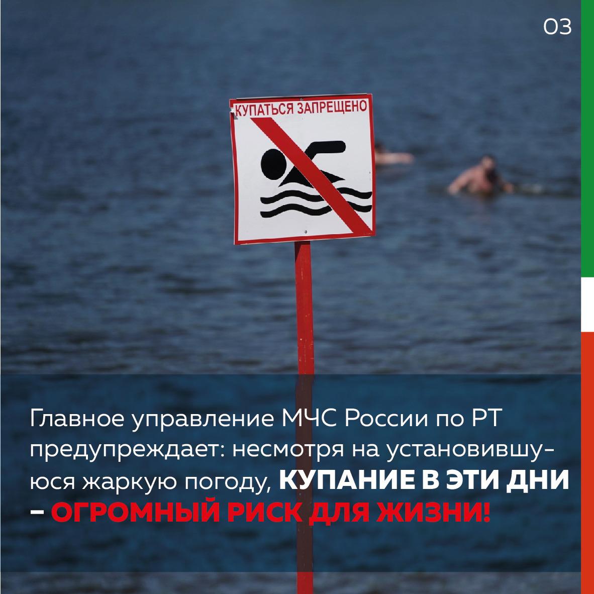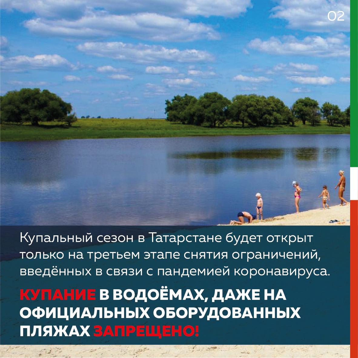 ❗Купальный сезон в Татарстане будет открыт только на третьем этапе снятия ограничений, введённых в связи с пандемией коронавируса. Купание в водоёмах, даже на официальных пляжах, оборудованных для купания, запрещено. За этим следят административные комиссии.