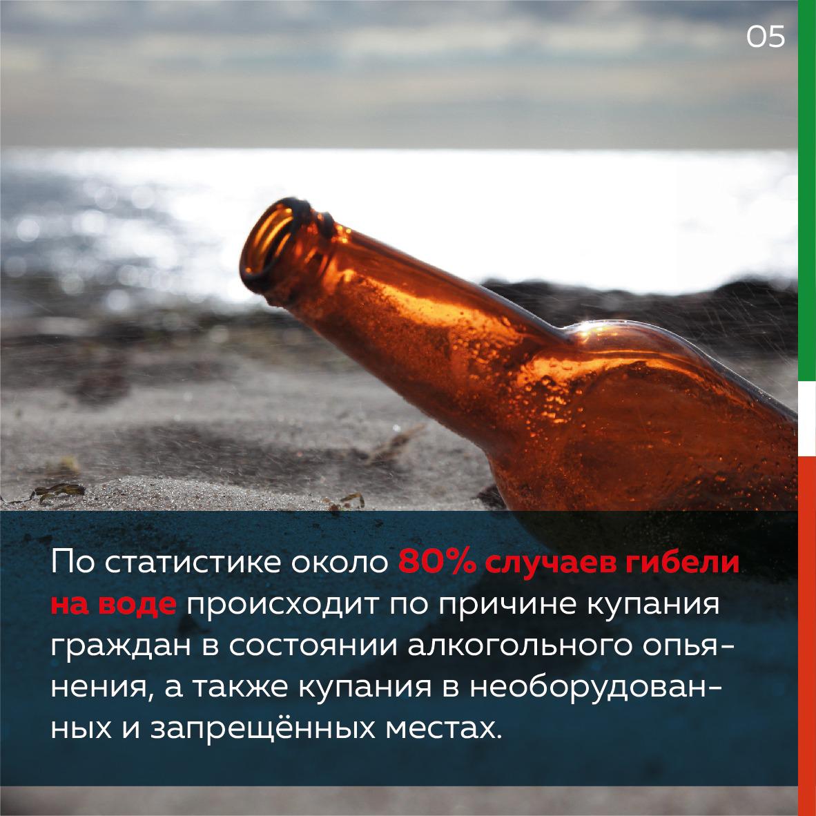 ❗По статистике около 80% случаев гибели на воде происходит по причине купания в состоянии алкогольного опьянения, а также купания в необорудованных и запрещённых местах.