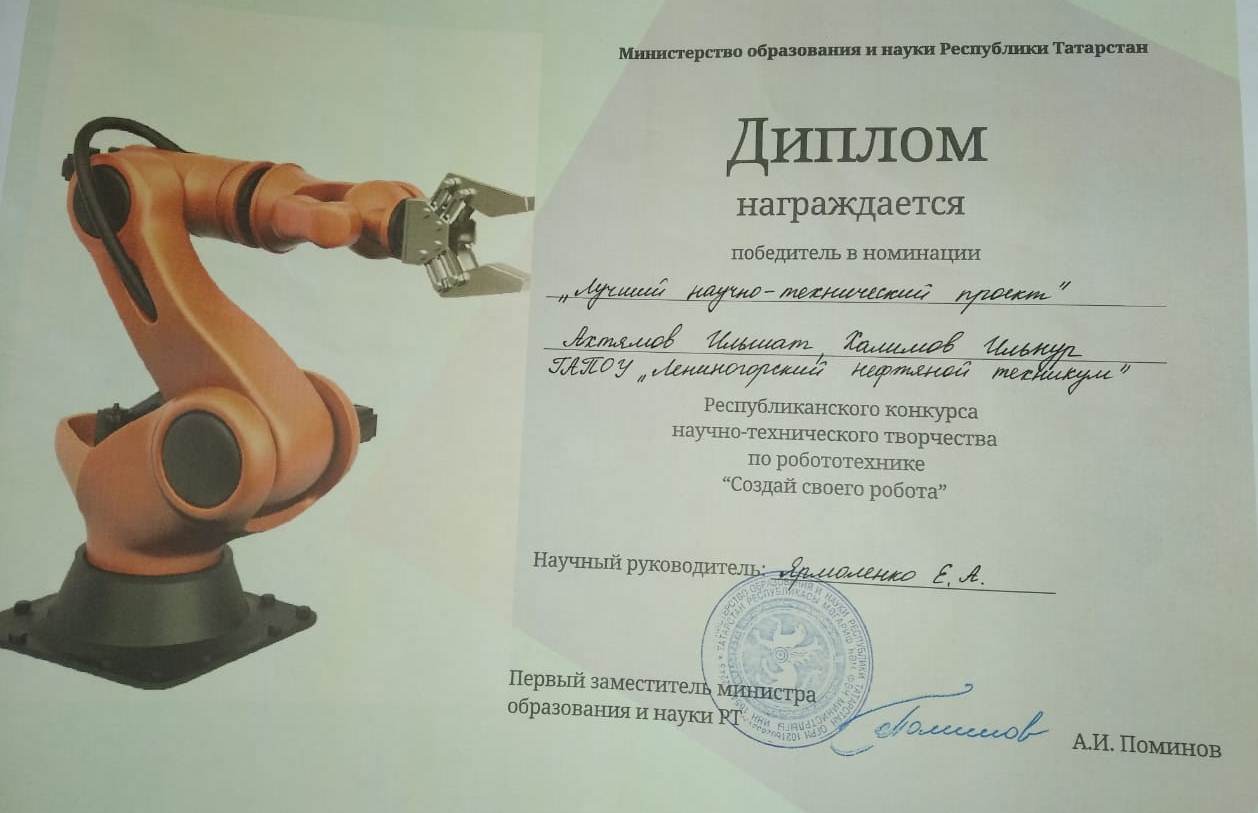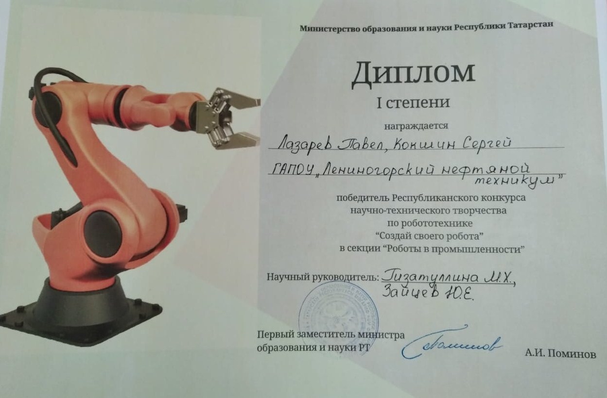 В направлении «Роботы в промышленности» 1 место с работой «Автоматическая система управления сервоприводом «Siemens» заняли Лазарев Павел и Кокшин Сергей (научные руководители Гизатуллина М.Х., Зайцев Ю.Е.), в номинации «Лучший научно-технический проект» с работой «Управление автоматическим освещением производственных объектов» победу одержали Ахтямов Ильшат и Халимов Ильнур (научный руководитель Ярмоленко Е.А.).