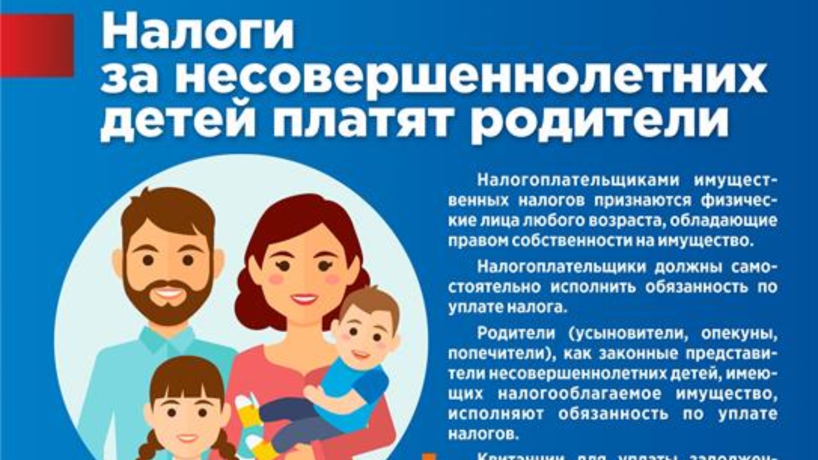 Родители (усыновители, опекуны, попечители) как законные представители несовершеннолетних детей, имеющих в собственности имущество, подлежащее налогообложению, осуществляют обязанность по уплате налогов.
