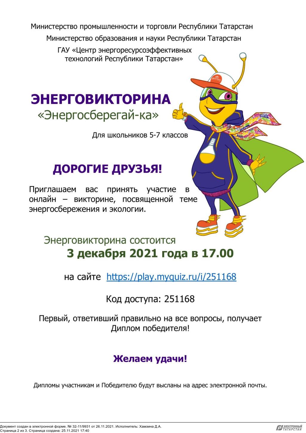 Министерство промышленности и торговли Республики Татарстан (далее – Министерство), во исполнение Распоряжения Кабинета Министров от 07.10.2021 №1997-р о проведении социальной кампании в поддержку Всероссийского фестиваля энергосбережения и экологии #ВместеЯрче-2021, совместно с ГАУ «Центр энергоресурсоэффективных технологий Республики Татарстан» сообщает о проведении интеллектуально-познавательной энерговикторины «Энергосберегай-ка» на тему «Экология и энергосбережение» с участием школьников