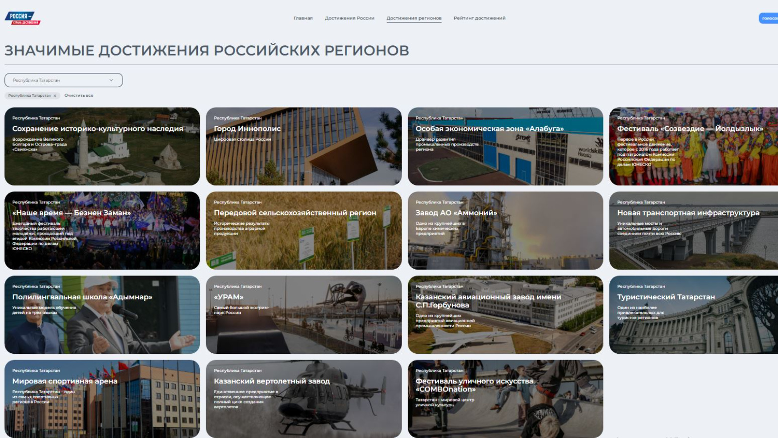 От Татарстана на сайте представлено 15 объектов различных сфер – культура, спорт, сельское хозяйство, промышленность, транспортная инфраструктура, туристическая отрасль. Среди них: Казанский авиационный завод имени С.П.Горбунова, реализующий масштабные проекты по развитию гражданской и военной авиации, цифровая столица России – город Иннополис, объекты историко-культурного наследия Татарстана – Болгар и Свияжск, ОЭЗ «Алабуга» - первая в России и одна из самых успешных особых экономических зон, это транспортная инфраструктура нашей республики, ее достижения сельском хозяйстве, это самый большой экстрим-парк в России – парк «Урам», это фестивальные движения по поддержке талантов «Наше время – Безнең заман» и «Созвездие-Йолдызлык», это уникальная модель обучения – полилингвальная школа «Адымнар» и другие проекты.