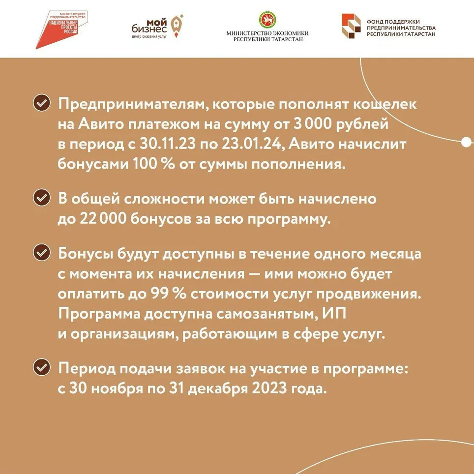Бонусы будут доступны в течение одного месяца с момента их начисления – ими можно будет оплатить до 99% стоимости услуг продвижения. Программа доступна самозанятым, ИП и организациям, работающим в сфере услуг.