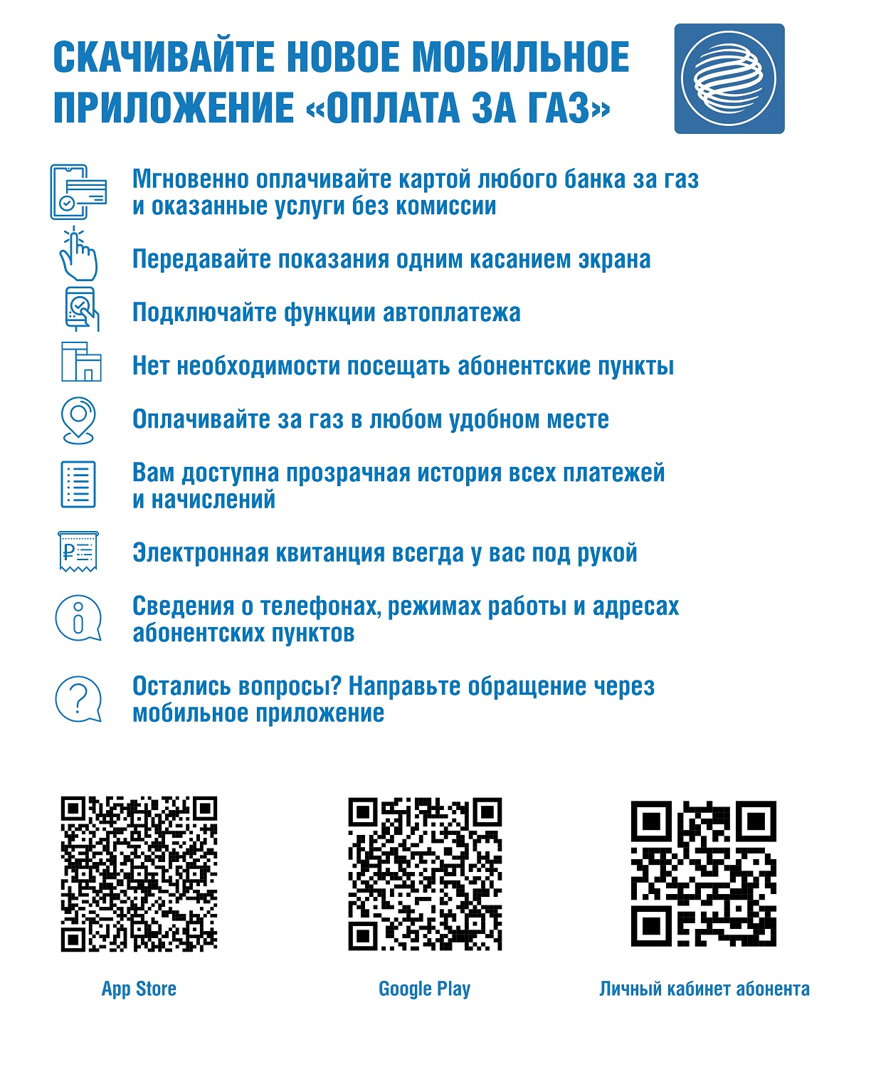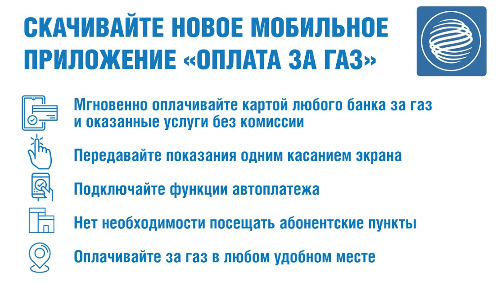 Теперь не нужно тратить время на посещение абонентских пунктов. Оплачивать за газ можно в любом удобном месте с мобильного устройства.