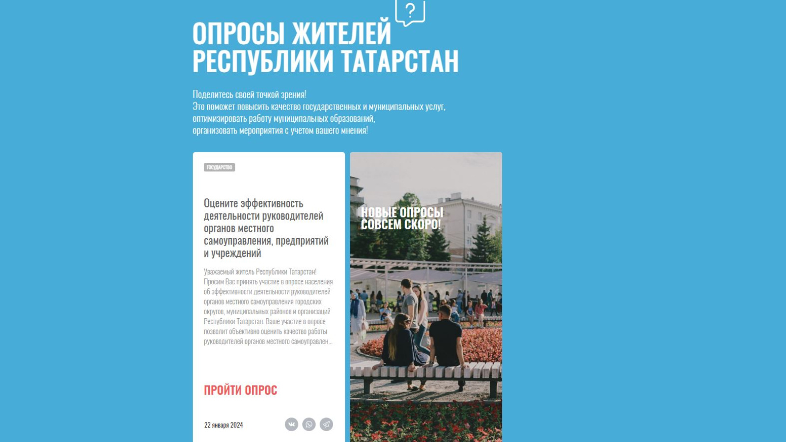 В соответствии с Указом Президента Республики Татарстан от 29.01.2014 № УП-79 в Республике Татарстан с начала 2024 года проводится социологический опрос об эффективности деятельности руководителей органов местного самоуправления городских округов и муниципальных районов Республики Татарстан, унитарных предприятий и учреждений, действующих на республиканском и муниципальном уровнях, акционерных обществ, контрольный пакет акций которых находится в собственности Республики Татарстан или в муниципальной собственности, осуществляющих оказание услуг населению городских округов и муниципальных районов Республики Татарстан.