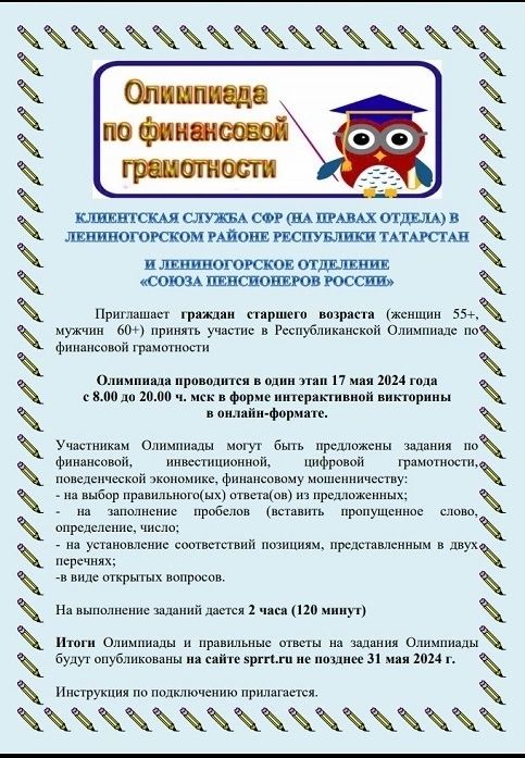 Клиентская служба СФР в Лениногорском районе и Лениногорское отделение "Союза пенсионеров России" приглашают граждан старшего возраста (женщин 55+, мужчин 60+) принять участие в Республиканской Олимпиаде по финансовой грамотности.