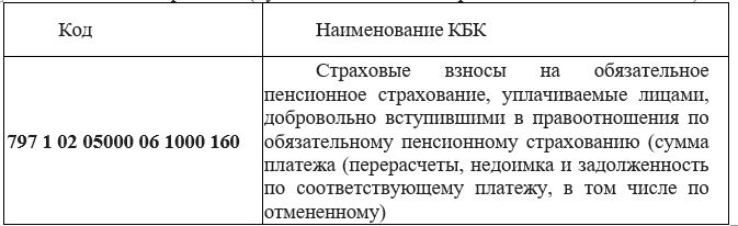Тип платежа: - «Уплата страховых взносов лицами, добровольно вступившими в правоотношения по ОПС»;