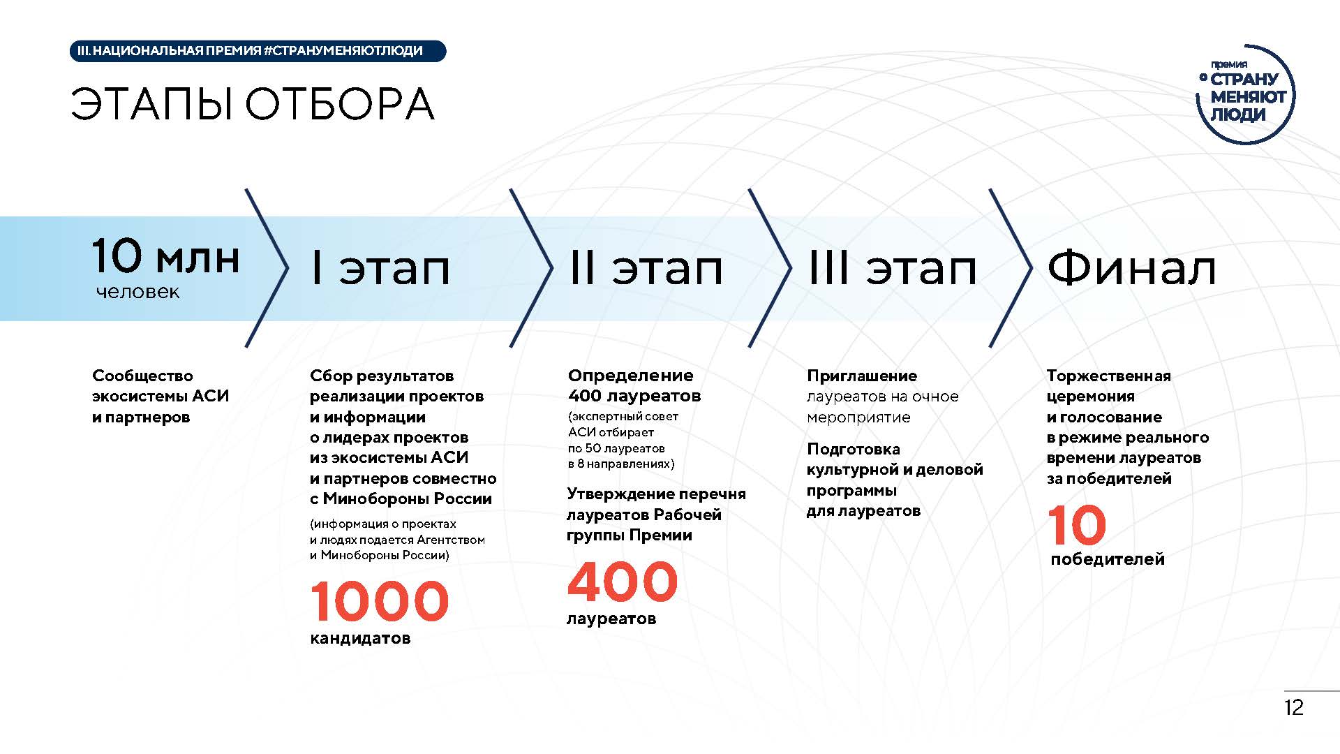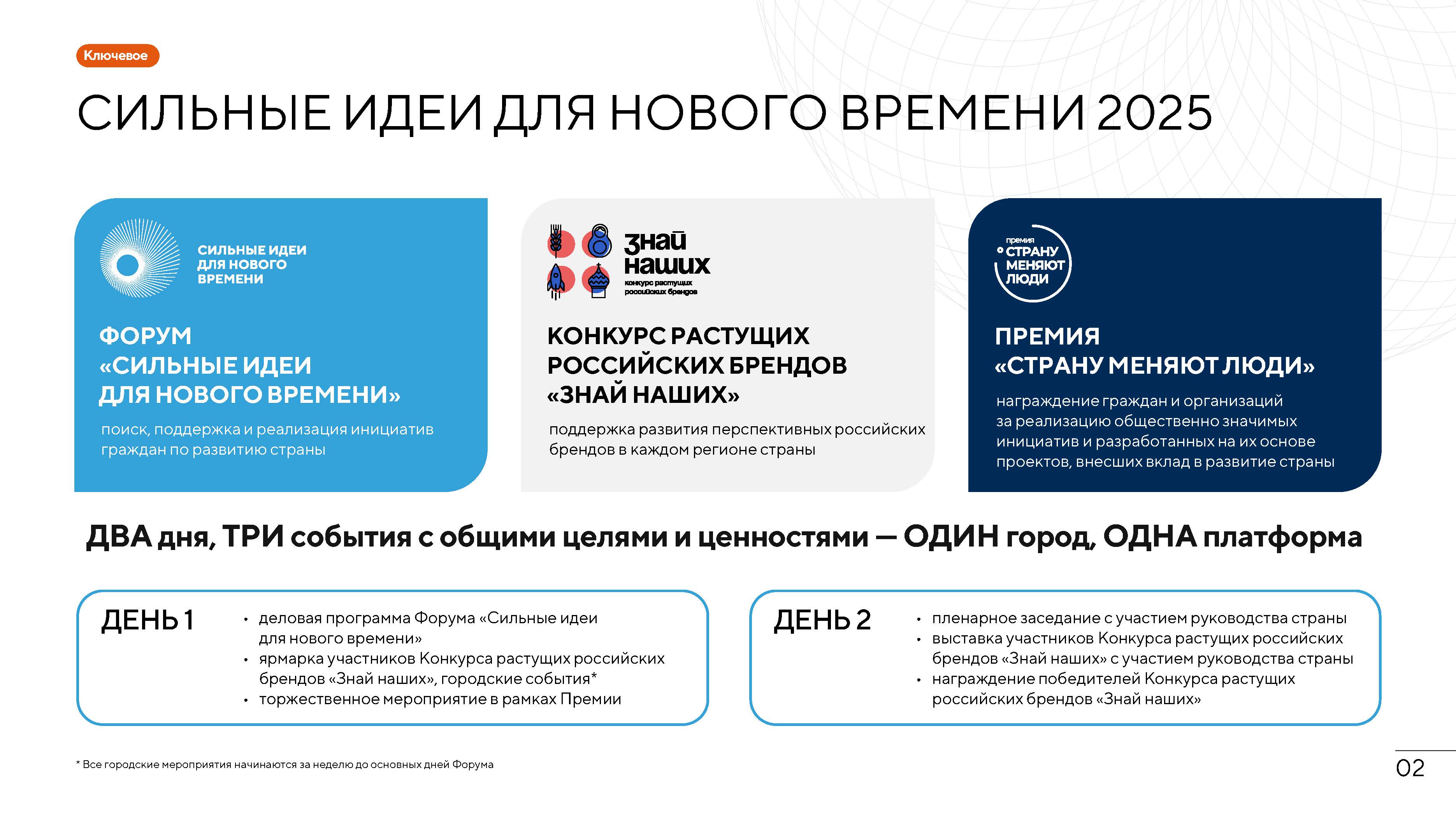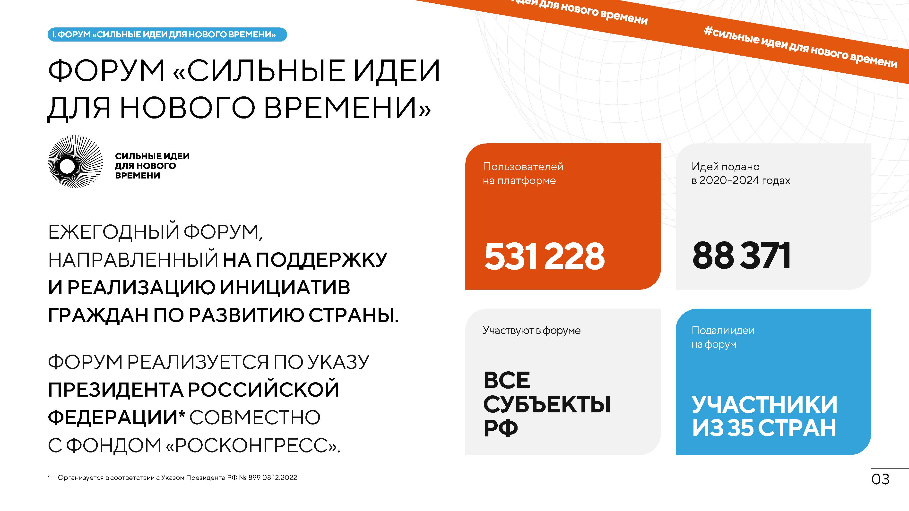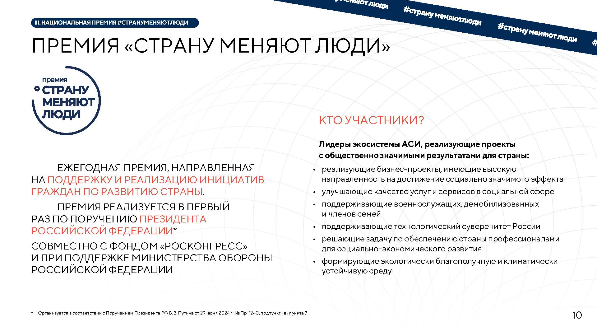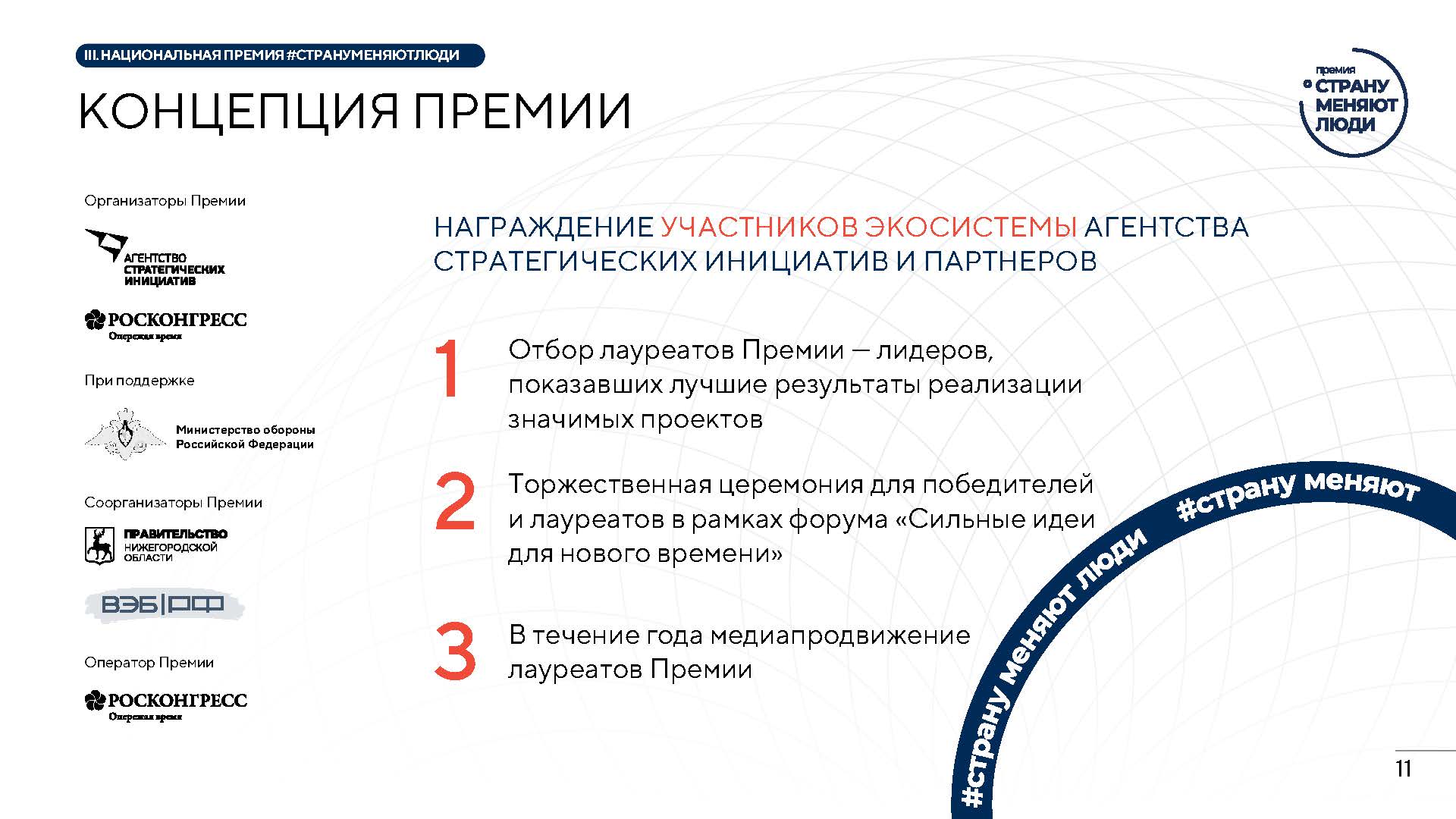 В соответствии с Указом Президента Российской Федерации В.В.Путина от 08.12.2022 № 899 «Об Организационном комитете по подготовке и проведению форума «Сильные идеи для нового времени» и подпунктом «б» пункта 7 перечня поручений Президента Российской Федерации по итогам заседания наблюдательного совета автономной некоммерческой организации «Агентство стратегических инициатив по продвижению новых проектов» (далее — Агентство) от 30.03.2023 № Пр-648 Агентство совместно с Фондом «Росконгресс» организует подготовку и проведение ежегодного форума «Сильные идеи для нового времени» (далее — Форум) и конкурса растущих российских брендов «Знай наших» (далее — Конкурс), а также в соответствии с подпунктом «а» пункта 7 поручения Президента Российской Федерации В.В.Путина от 29.06.2024 № Пр-1240 Агентство совместно с Фондом «Росконгресс» при поддержке Министерства обороны Российской Федерации впервые организует проведение ежегодной премии «Страну меняют люди» (далее — Премия).