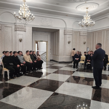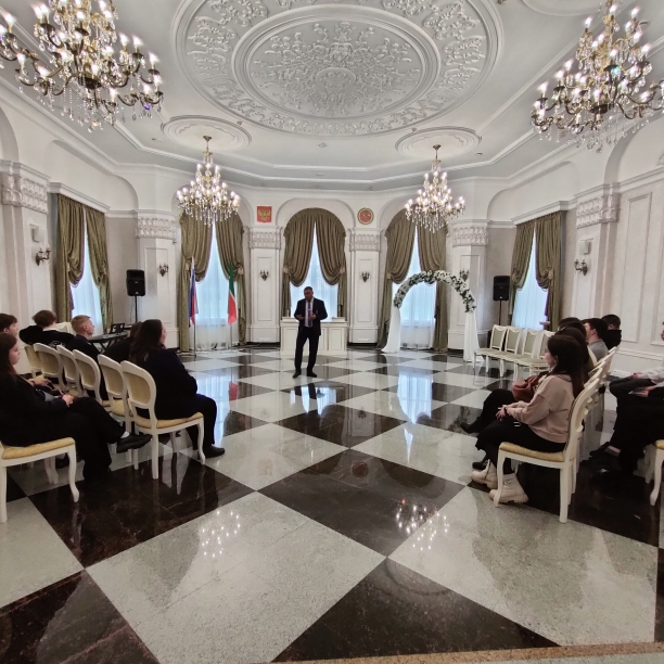 В рамках 80-летия Великой Победы во Дворце бракосочетаний города Лениногорска сотрудники МБУ "Центр психолого-педагогической помощи детям и молодежи "Логос" совместно с сотрудниками отдела ЗАГС провели мероприятие «Урок мужества» для студентов Лениногорского нефтяного техникума.