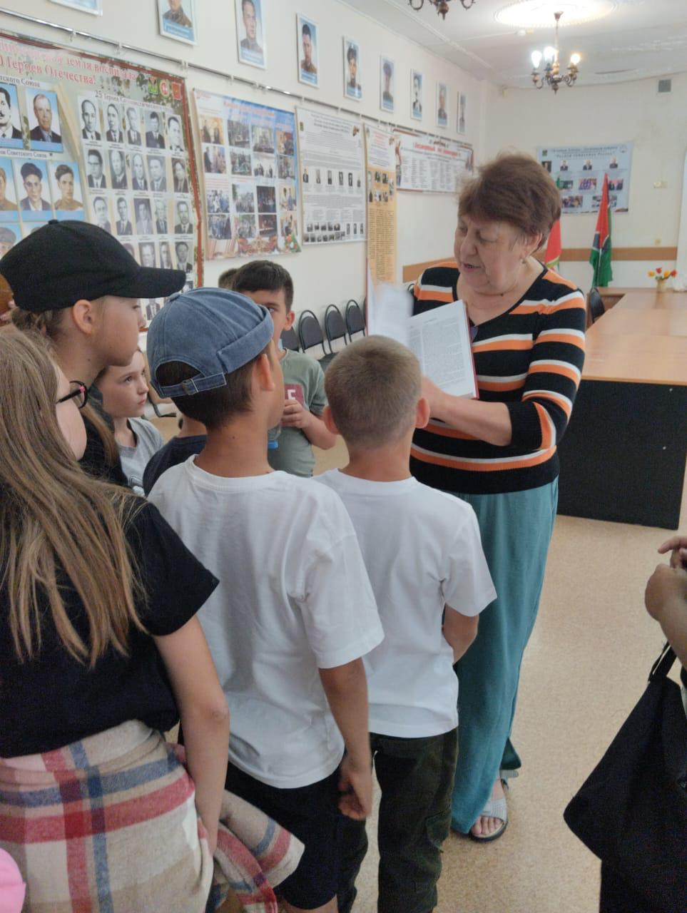 Сотрудники Совета ветеранов вместе с председателем Галиёй Халимовой познакомили ребят с историей нашего города, героями войны и труда. С особым интересом дети слушали о подвиге нашего земляка, Героя России Дамира Исламова.
