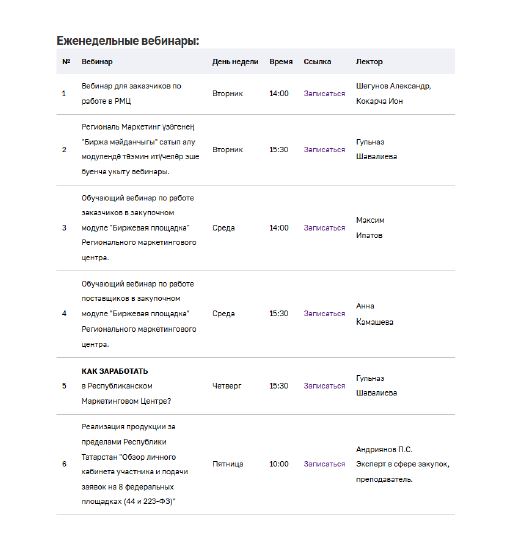 Агентство еженедельно проводит вебинары для малого и среднего бизнеса по теме: «КАК ЗАРАБОТАТЬ в Республиканском Маркетинговом Центре?» (ссылка https://my.mts-link.ru/agzrt/rmcrt2023 ), Реализация продукции за пределами Республики Татарстан "Обзор личного кабинета участника и подачи заявок на 8 федеральных площадках (44 и 223-ФЗ)" https://my.mts-link.ru/j/agzrt/1obzorETP , список всех вебинаров https://rmcrt.ru/webinar.html .
