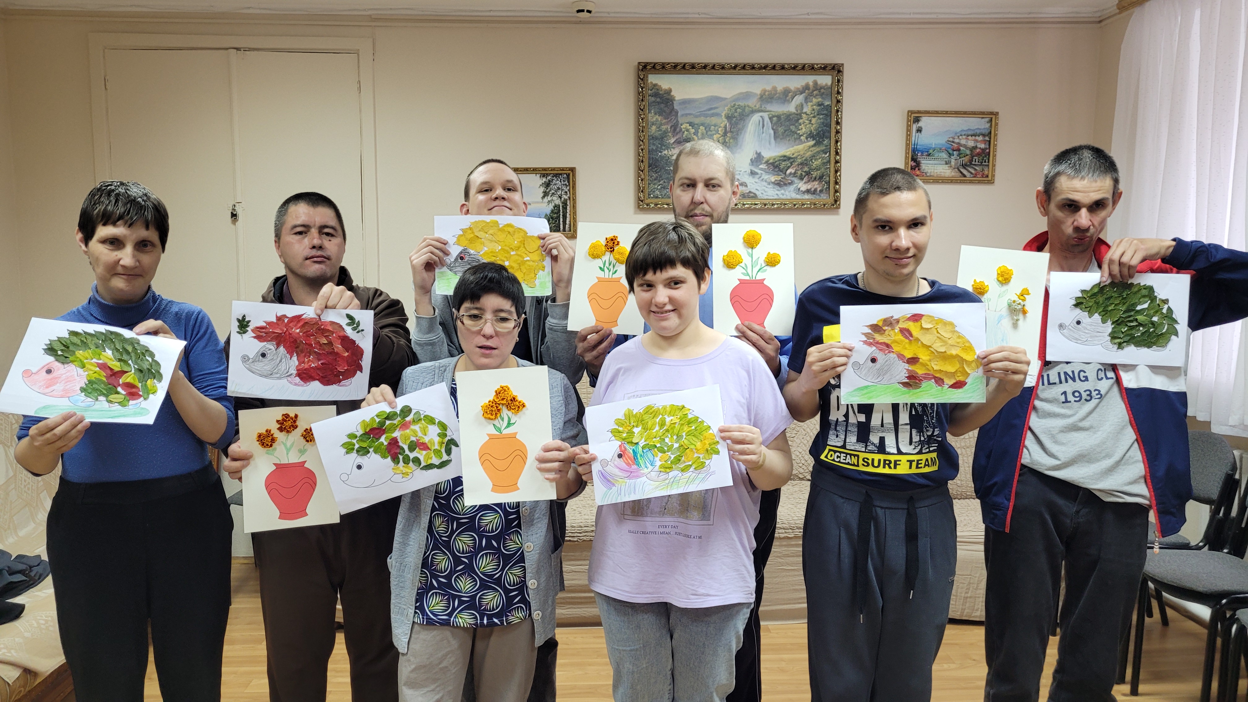 Очередное занятие было посвящено созданию осенней композиции. В ходе творческого процесса ребята совершенствовали навыки работы с различными материалами. В процессе работы специалисты применяли индивидуальный подход к каждому участнику.