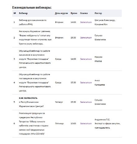 Агентство еженедельно проводит вебинары для малого и среднего бизнеса по теме: «КАК ЗАРАБОТАТЬ в Республиканском Маркетинговом Центре?» (ссылка https://my.mts-link.ru/agzrt/rmcrt2023 ), Реализация продукции за пределами Республики Татарстан "Обзор личного кабинета участника и подачи заявок на 8 федеральных площадках (44 и 223-ФЗ)" https://my.mts-link.ru/j/agzrt/1obzorETP , список всех вебинаров https://rmcrt.ru/webinar.html .