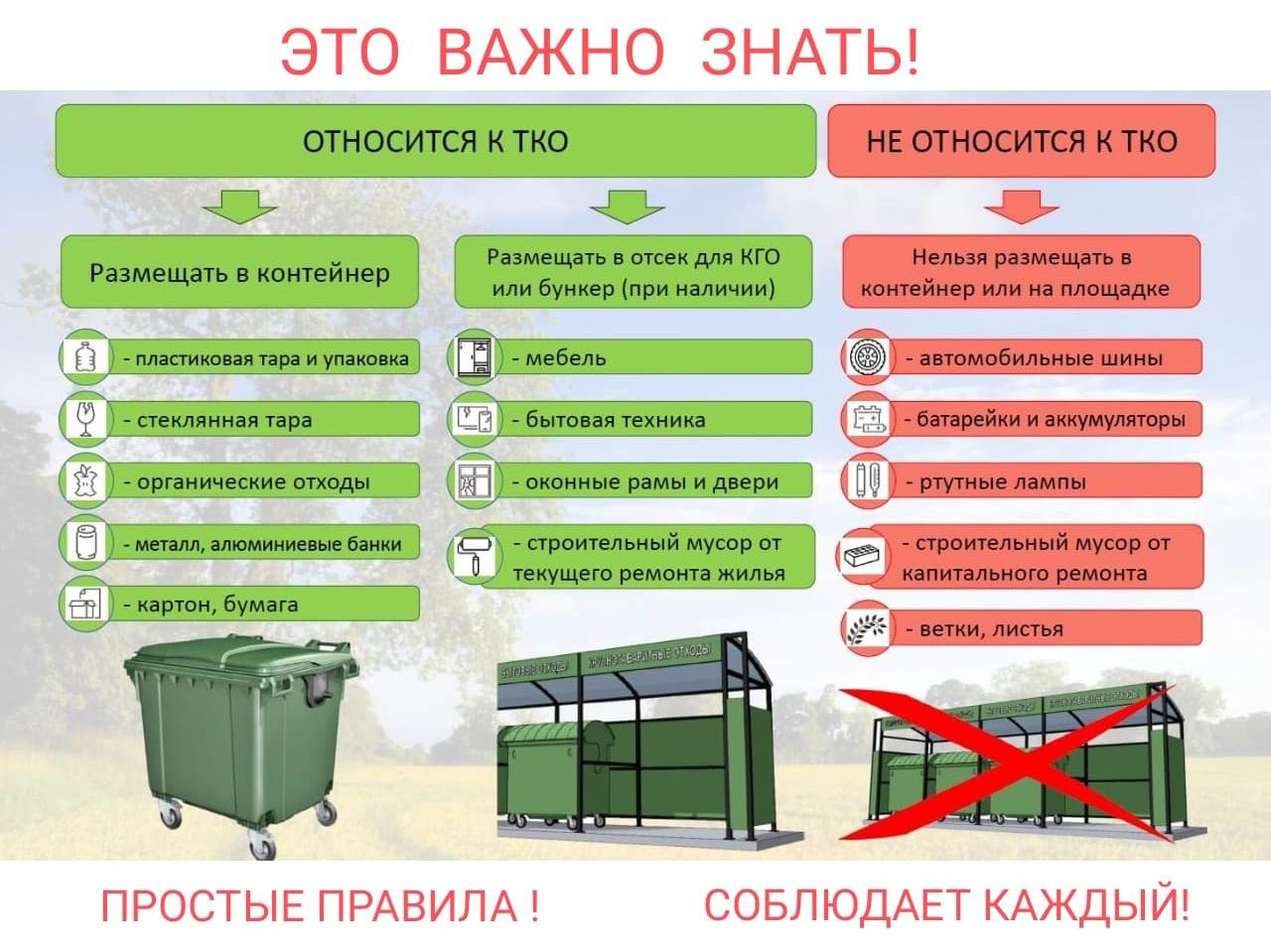 Запрещено складирование в бункерах горящих, раскалённых или горячих отходов, снега и льда, осветительных приборов и электрических ламп, содержащих ртуть, батарей и аккумуляторов, медицинских отходов, отходов строительства и ремонта (за исключением текущего) и иных отходов, которые могут повредить контейнеры, мусоровозы или иные транспортные средства.