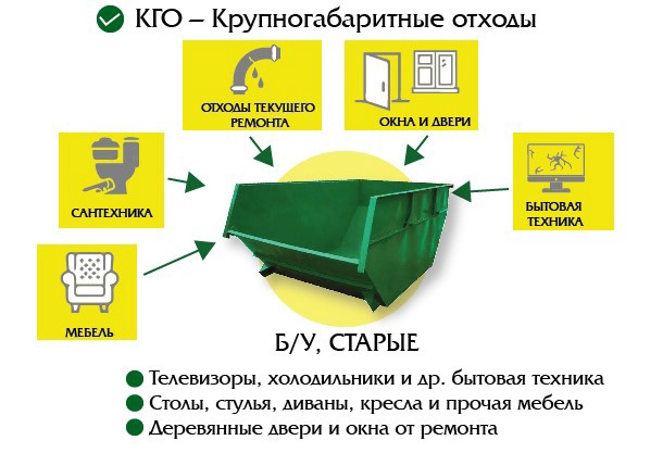 Крупногабаритные отходы (КГО) складируют в бункеры в соответствии с законодательством РФ в области обращения с отходами производства и потребления. Это твёрдые коммунальные отходы (мебель, бытовая техника, отходы от текущего ремонта жилых помещений и др.), размер которых не позволяет осуществить их складирование в контейнерах.