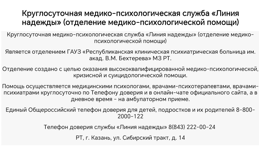 «Линия Надежды»— это бесплатная круглосуточная психологическая служба поддержки для жителей Татарстана и всей России. Она создана для того, чтобы помочь людям в трудную минуту.