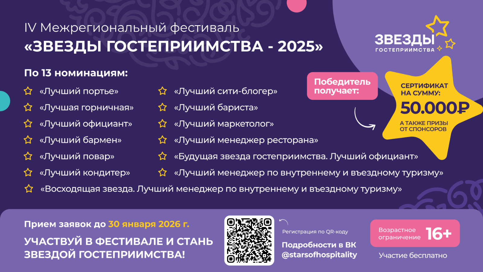 В период с 25 по 27 февраля 2026 года Мэрия города Казани при поддержке Ассоциации городов Поволжья проводит IV межрегиональный фестиваль профессионального мастерства среди работников предприятий туристской, ресторанной и гостиничной индустрий «Звезды гостеприимства - 2025».