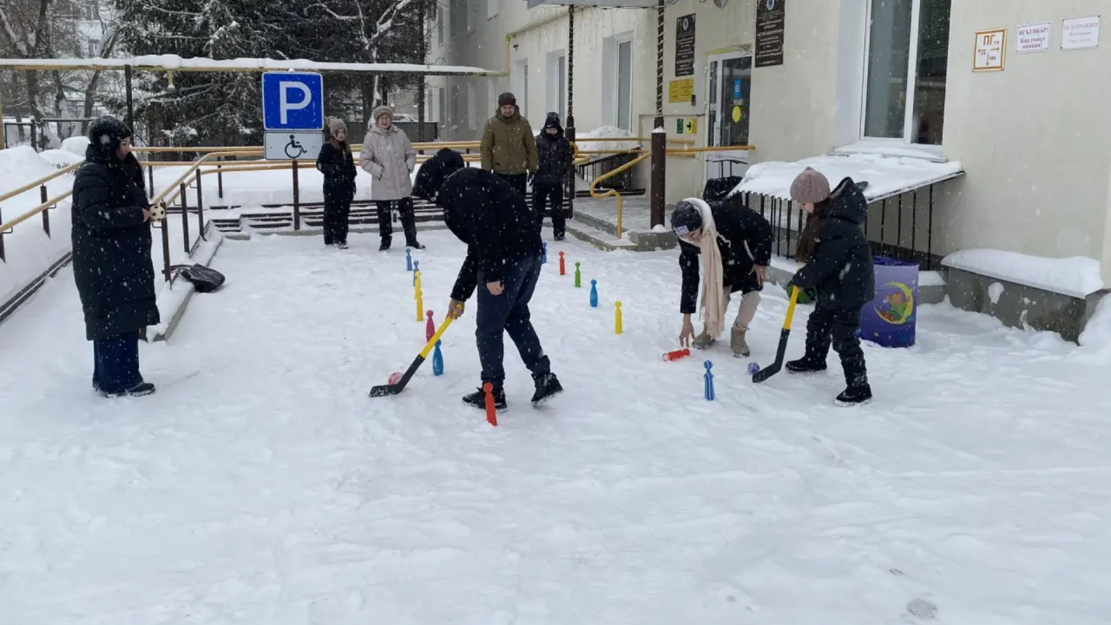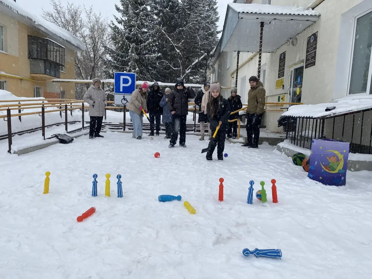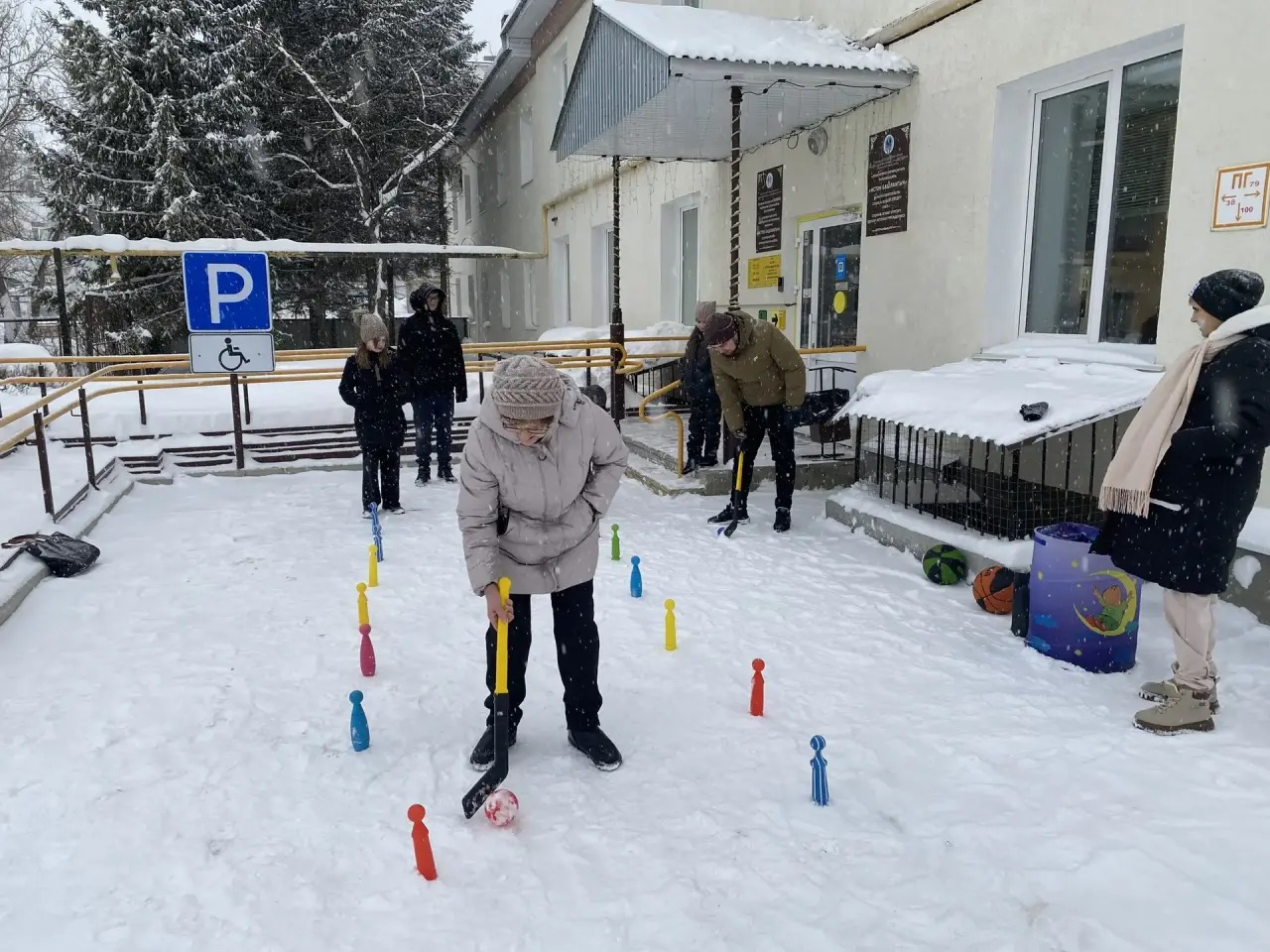 Небольшой снегопад — не помеха для спортивного праздника! Специалист по социальной работе Вахитова Алсу провела семейную эстафету для получателей услуг, превратив зимнюю погоду в дополнительный повод для веселья. Первое испытание было на ловкость: дети с небольшой клюшкой аккуратно проводили мячик между кеглями, выстроенными «змейкой», задача — не задеть ни одну. Сосредоточенные лица, осторожные движения, а потом радостные возгласы, когда получалось пройти. Во втором состязании нужно было не просто обойти препятствия, а выбивать кегли. Сплоченность и командный дух — всё смешалось в этом соревновании.