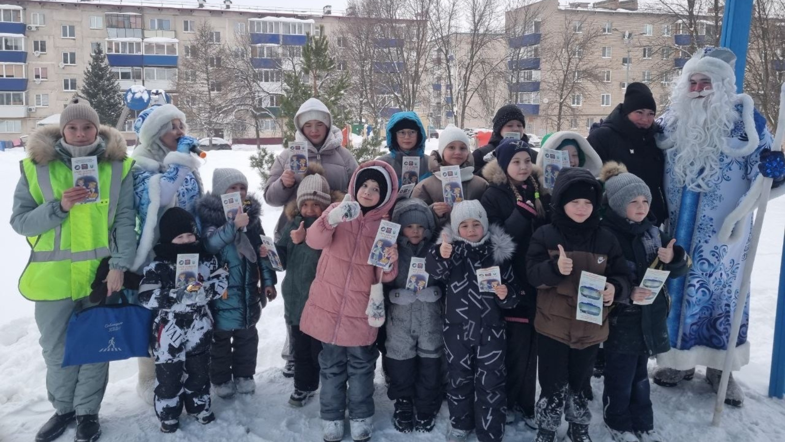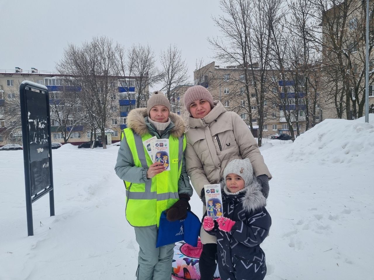 Детям и их родителям напомнили о правилах поведения на дороге зимой и вручили полезные подарки — тематические памятки о световозвращающих элементах, чтобы каждый был заметен в темноте.