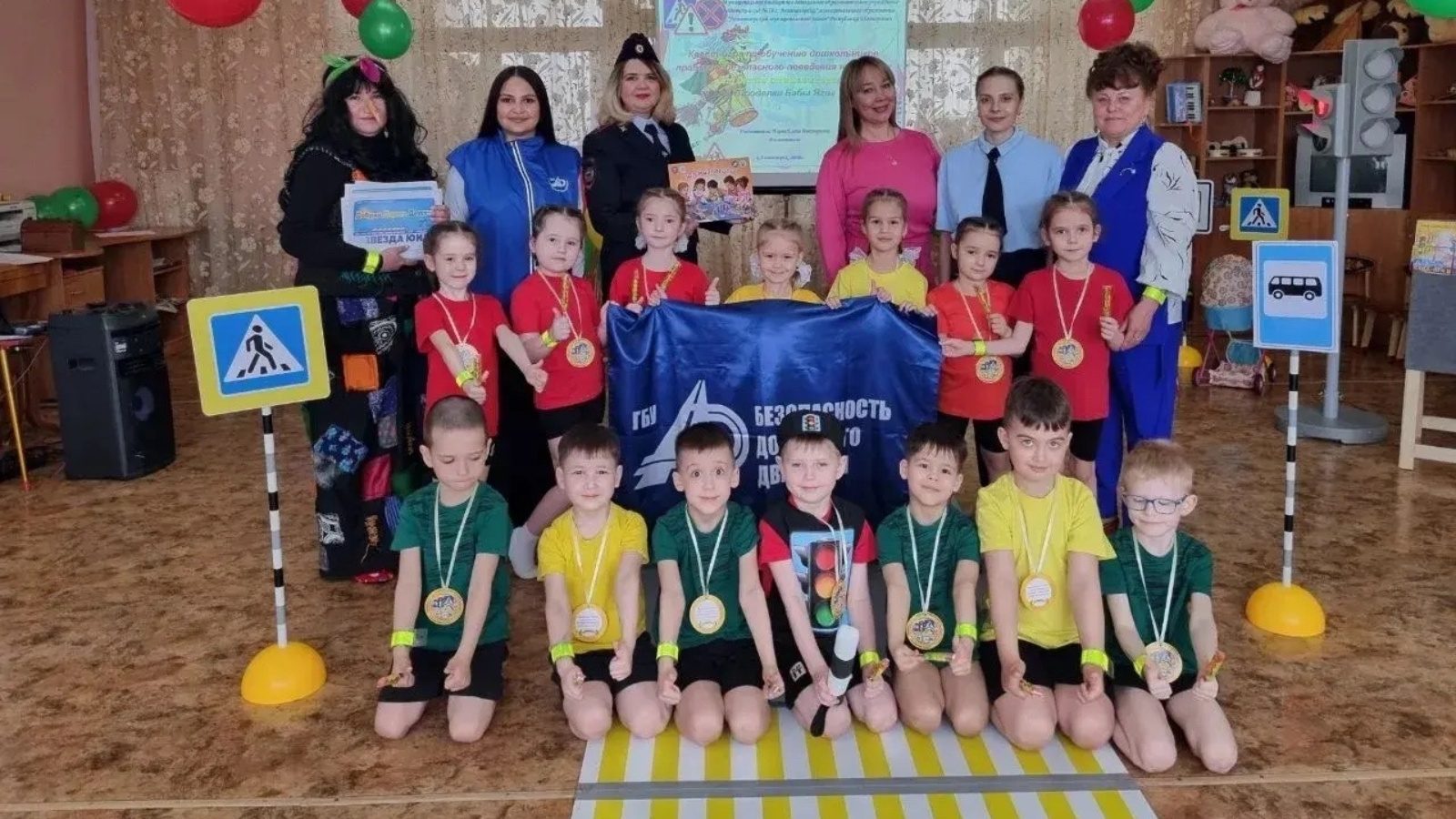 Ребята повторили правила дорожного движения в игровой форме. По сюжету, сказочная гостья — Баба-яга — оказалась в шумном городе и совсем растерялась среди обилия автомобилей, светофоров и дорожных знаков. На помощь лесной жительнице пришли юные инспекторы дорожного движения.