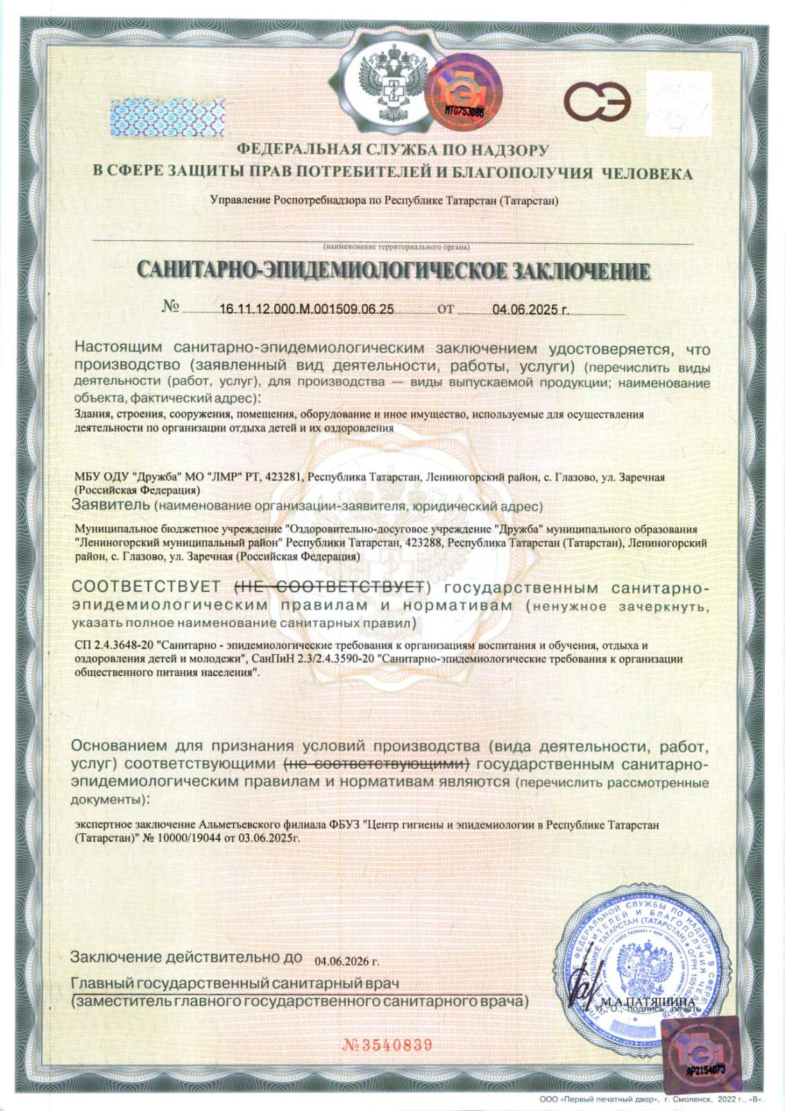 Санитарно-эпидемиологическое заключение Дружба