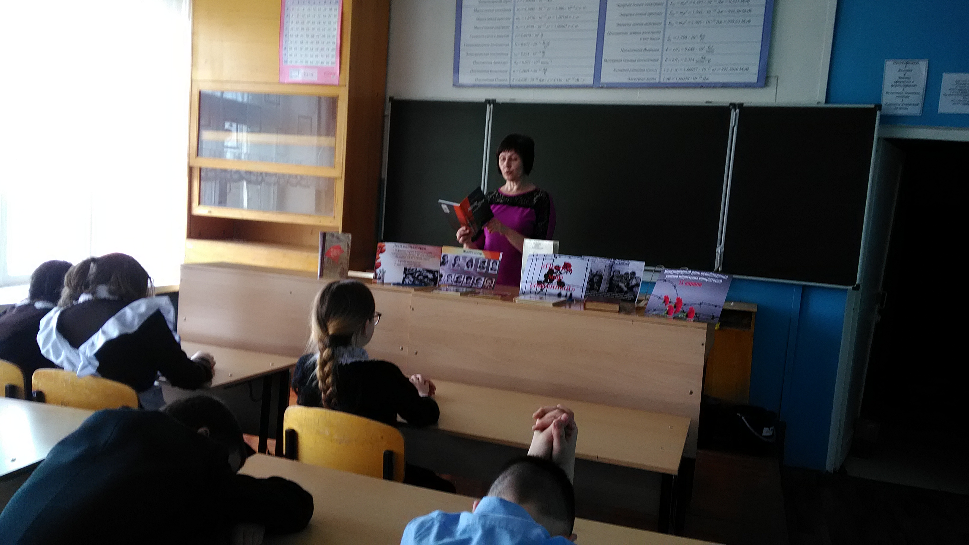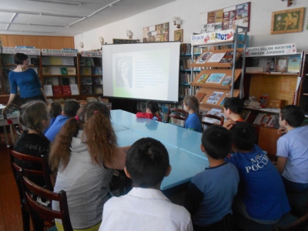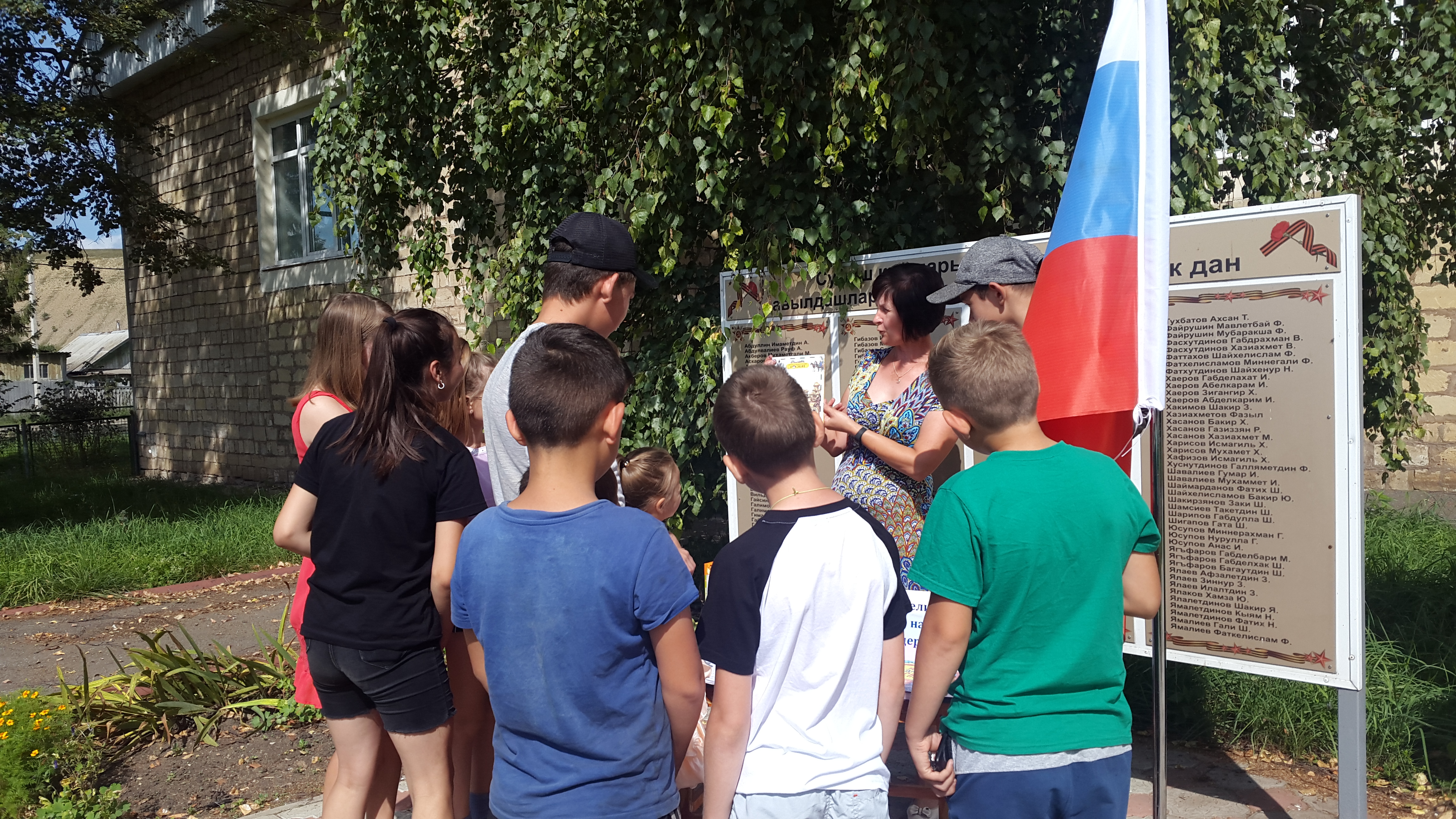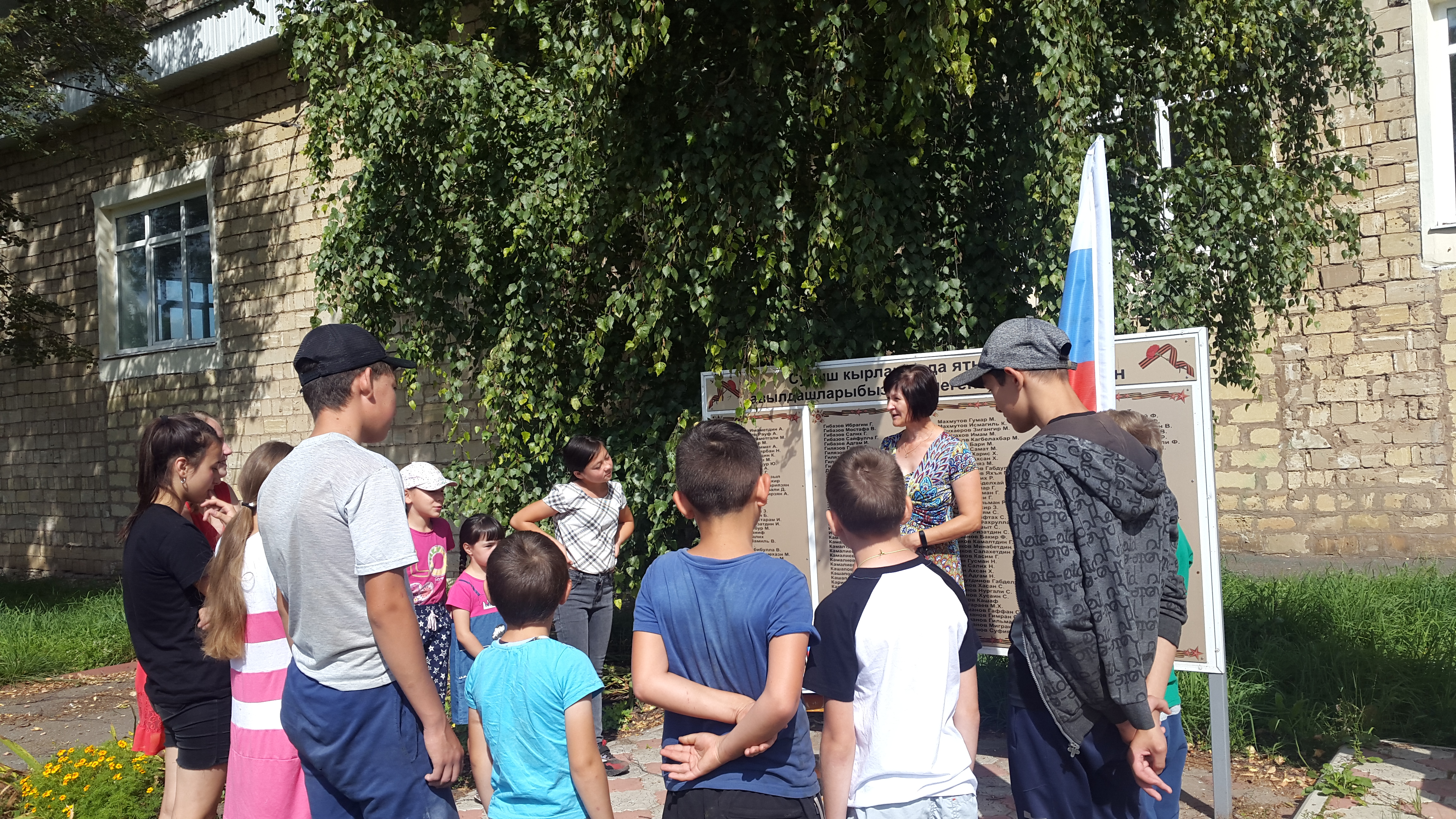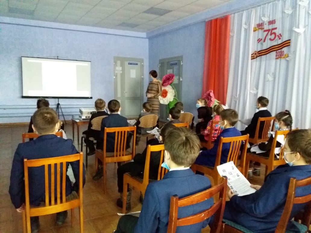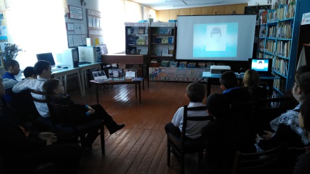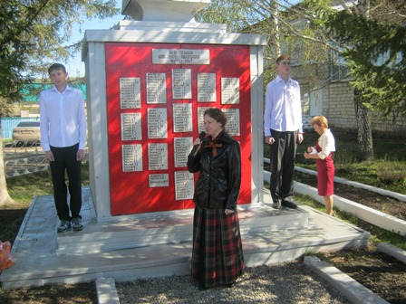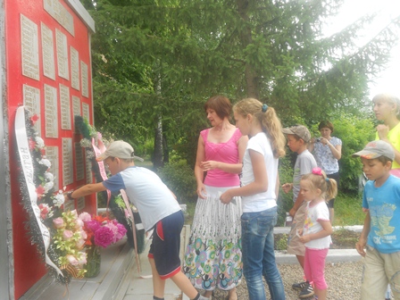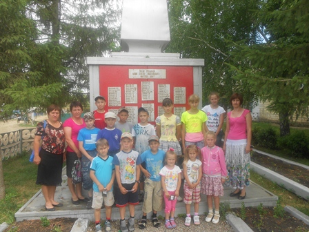 Потом посмотрели электронную презентацию «Великая Отечественная Война». В завершении мероприятия вышли к обелиску, почтили память погибших солдат минутой молчания и возложили цветы. Дети искали из списков погибших фамилию своего деда или родственника.