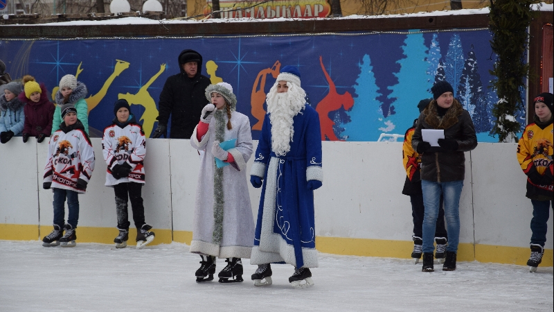 Ялтырап торган боз өстенә “Нефтяник” спорт мәктәбе, “Сокол” клубларына йөрүче хоккейчылар чыкты. Бәйрәмгә Кыш бабай белән Кар кызы да килгән иде. Алар уеннарда катнашкан егет-кызларга бүләккә - Боз сараенда шуарга 10 көнлек абонемент бирделәр.