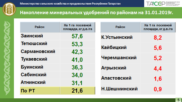 1,5 млрд.сум яки 1 гектарга 500 сумнан артык субсидия — максатчан, ягъни аларны киләчәктә бары тик ашламалар сатып алуга гына файдаланырга мөмкин. Ашлама төрен һәм тәэмин итүчеләрнең үзләрен сайлап алу авыл хуҗалыгы формированиеләре сайлауларына кала. Быел гектарына 70 килограммнан артык тәэсир итүче матдә туплау бурычы куелды. Шуңа күрә түбән күрсәткечләр булган районнарга активланырга кирәк. Әлеге ярдәм 30 мартка кадәр генә саклана.