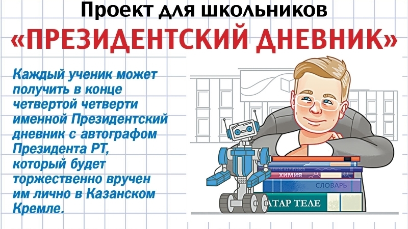 Татарстанда беренче тапкыр уза торган «Президент көндәлеге» конкурсы тәмамлану стадиясендә. Бу Казанда «Комсомольская правда» газетасы һәм ТР Мәгариф һәм фән министрлыгының уртак акциясе, анда икенчедән унберенче сыйныфка кадәр һәр укучы катнаша ала. Конкурс нәтиҗәләре 31нче майда билгеле булачак. Һәр укучы дүртенче чирек ахырында Татарстан Республикасы Президенты Рөстәм Миңнехановның автографы белән Президент көндәлеге ала алачак.