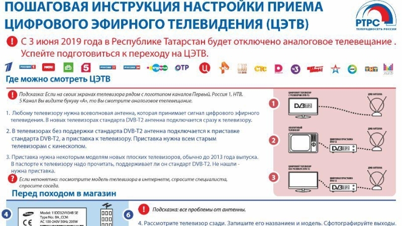 2019 елның 3 июнендә Татарстан Республикасында цифрлы телевидениегә тулы масштаблы күчү көтелә, аның кысаларында аналоглы эфир телетапшыруы тоташтырылачак. Әгәр телевизор экраннарында каналлар логотибы белән янәшә Беренче, Россия 1, НТВ, 5 Канал сез «А» хәрефен күрәсез икән, аналог телетапшыруларны карагыз. Цифрлы телевидениегә күчү кысаларында сезгә түбәндәгеләрне эшләргә кирәк:http://leninogorsk.tatarstan.ru/rus/index.htm/news/1474580.htm