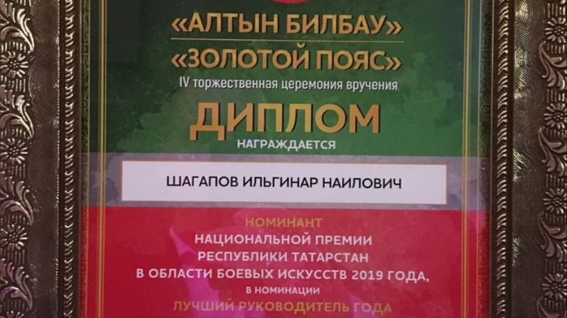 2019 елның 26 маенда 13.00 сәгатьтә Казанның "Уникс" концертлар залында Татарстан Республикасында сугышчан сәнгать өлкәсендә Алтын билбау" Татарстан Республикасы Милли Премиясен тапшыру тантанасы узды.