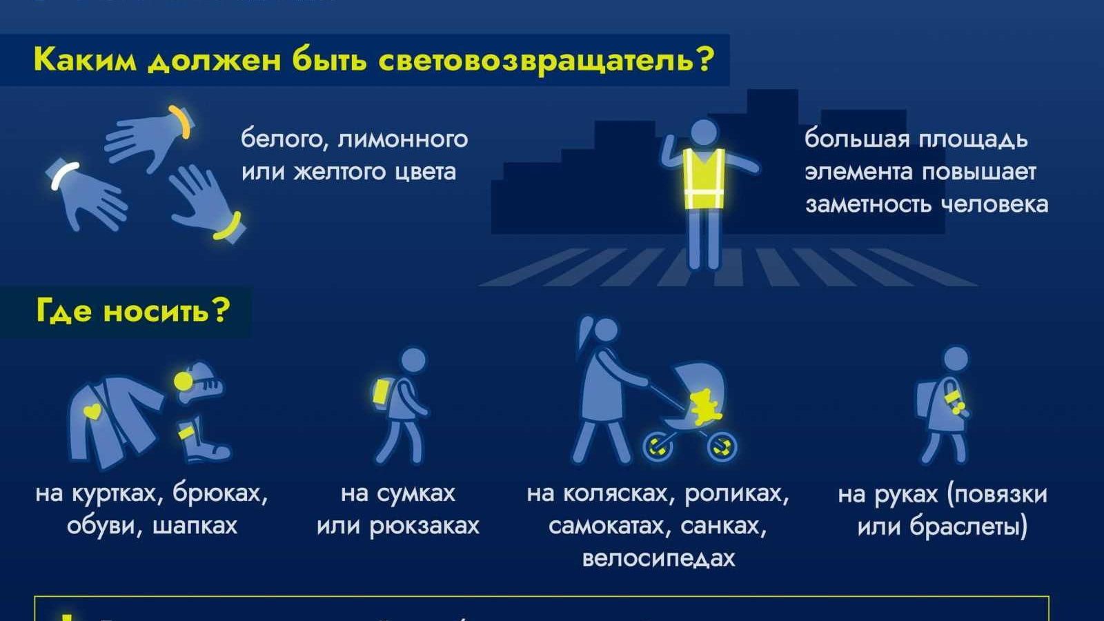 Хөрмәтле җәяүлеләр, онытмагыз, сезнең куркынычсызлыгыгыз сезнең кулда! Киемдә яктылык кайтаручы элементларны тәүлекнең караңгы вакытында яки күрү начар булган шартларда хәрәкәт иткәндә кулланыгыз. Моннан тыш, яшь юл хәрәкәтендә катнашучыларга аерым игътибар бирегез.